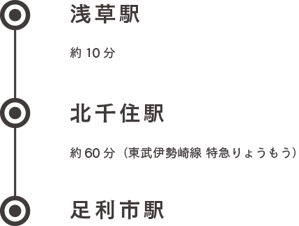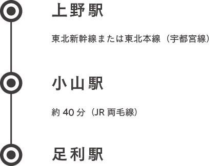 2011年3月19日の北関東自動 車道足利IC開通(全線開通)により、足利市へのアクセスが大変便利になりました。 足利ICから市内までは、約10分です。太田桐生ICや佐野田沼IC、又は東北自動車道 佐野藤岡ICも便利です。
