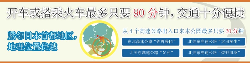 驾车来园时 周六日和节假日以外的工作日的交通比较顺畅。免费临时停车场6000个车位 【从东北高速公路】 ◎从佐野藤冈IC,沿国道50号线,朝前桥/足利方向开行(约18分钟) 【从北关东高速公路】 ◎从太田桐生IC,经由国道122号线,沿国道50号线,朝足利/小山方向开行(约20分钟) ◎从足利IC,经由国道293号线,沿县道67号线,朝佐野方向开行(约15分钟) ◎从佐野田沼IC,经由县道16号线,沿县道67号线,朝足利方向开行(约12分钟) ※括号内的所需时间为平时的大致时间。 配有完善的免费大型停车场大型巴士/40个车位 普通车辆/300个车位