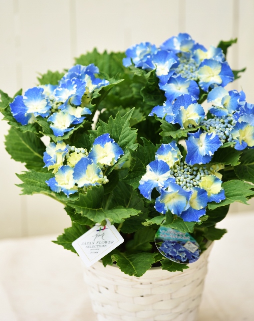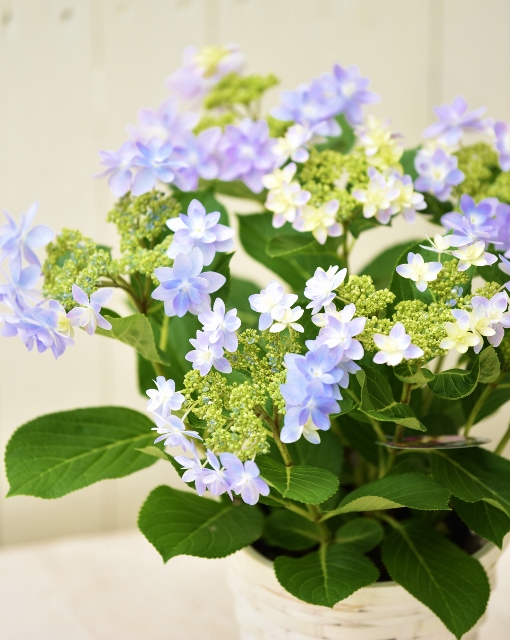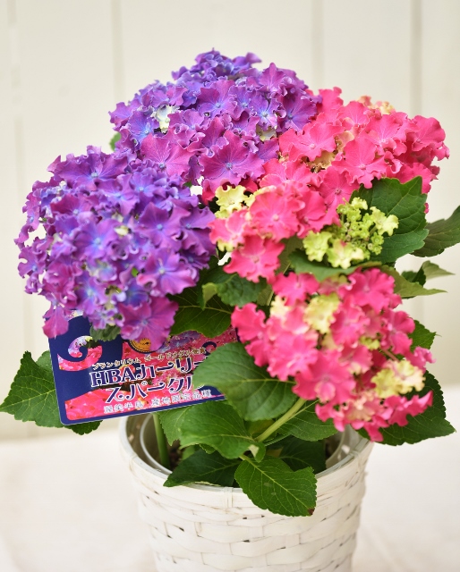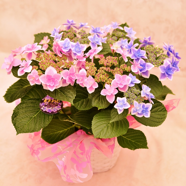 土の酸性度によって花色が変わるアジサイを、一鉢の中で2色咲かせた特別仕立て。