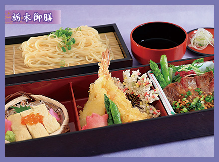レストラン「ウェステリア」で園内のお花を眺めつつ、地元の食材を味わおう。栃木県を代表する食材「ゆば」と栃木県産下野牛をふんだんに使った「栃木御膳」は、料理長こだわりの一膳。デザートに、旬のさくらんぼを使ったスイーツはいかが??