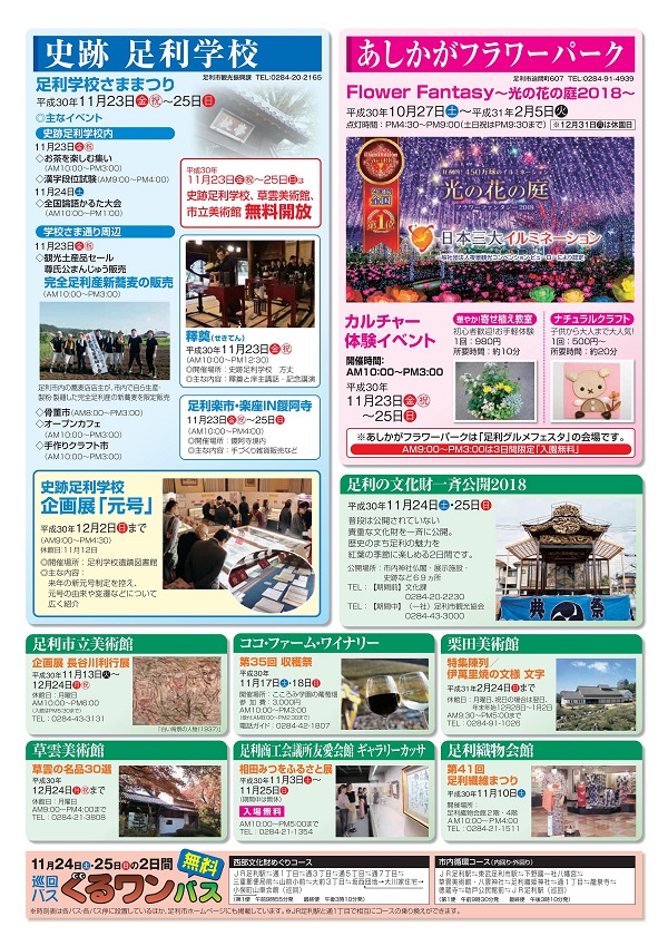 足利市内を巡回する「ぐるワンバス」が11/24(土)、25(日)に運行します。