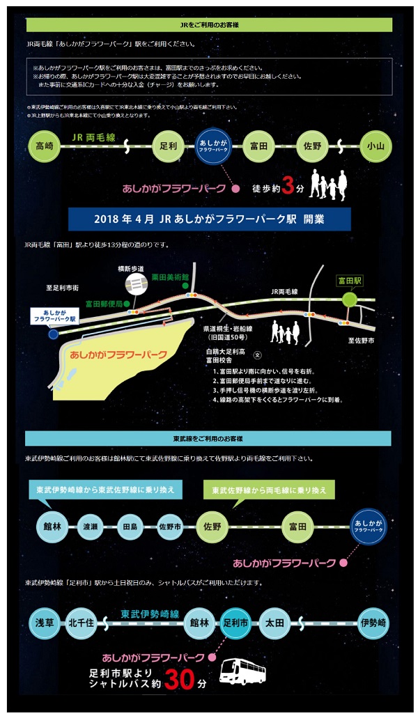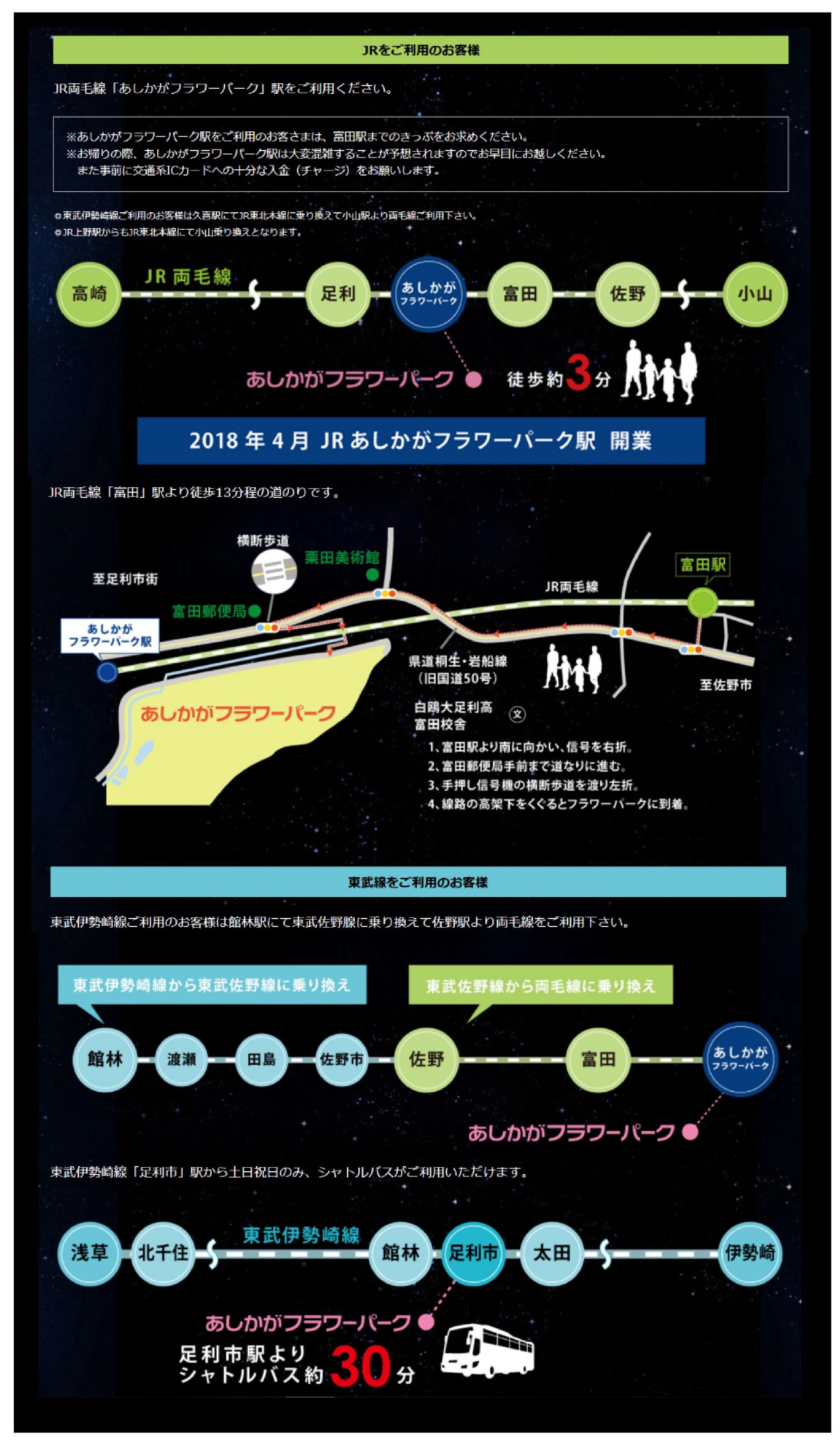 週末はJR両毛線「あしかがフラワーパーク駅」のご利用をお勧めいたします。