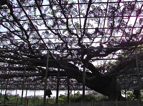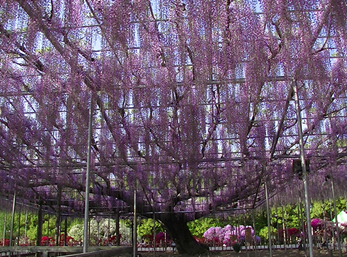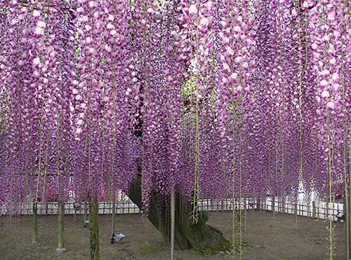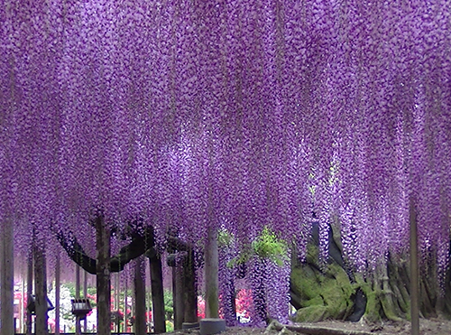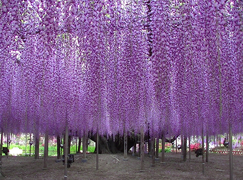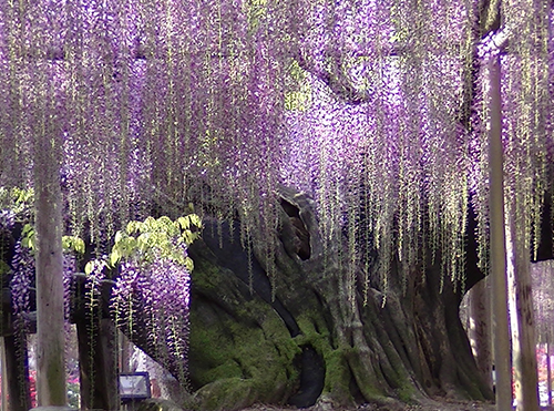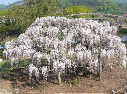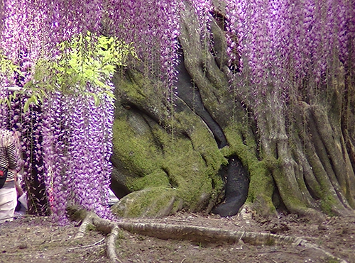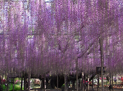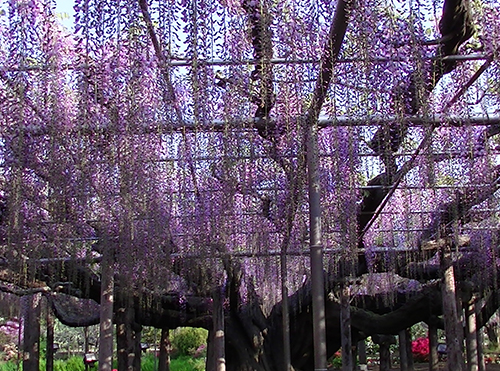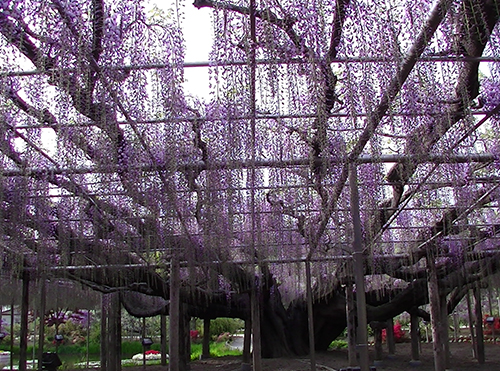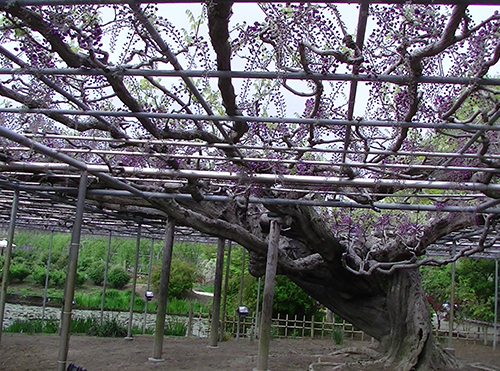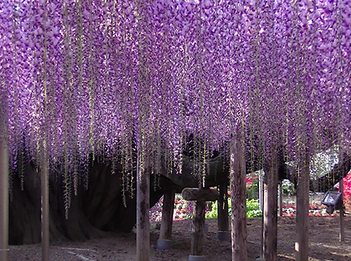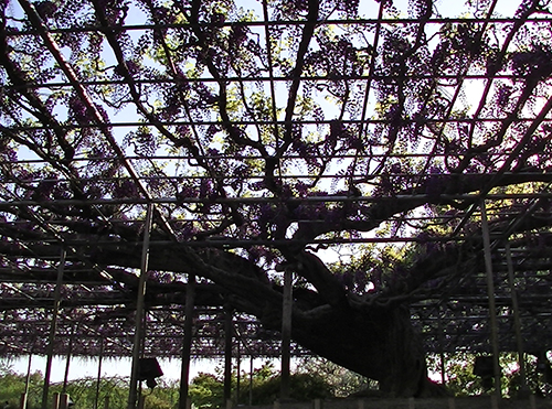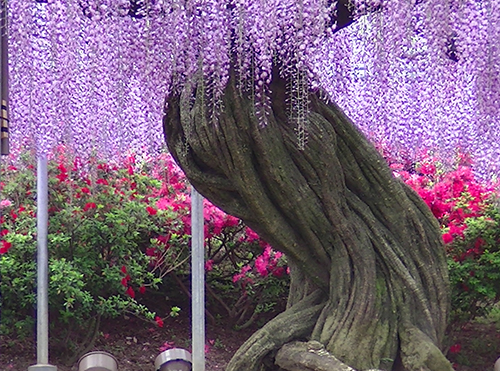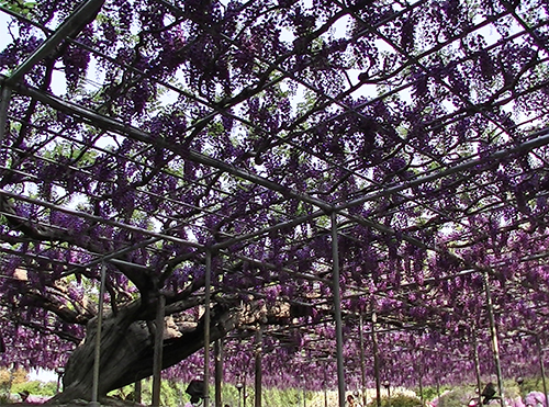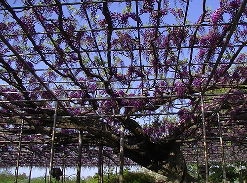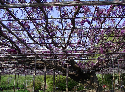 園内に250トンを超える炭を敷き詰めて植物をはじめ、すべての生命体の活力を高めています。 この大藤はまさにパワースポット!今年もたわわに花房をつけ、その生命力を発散しています。