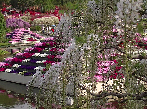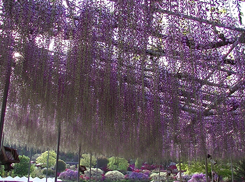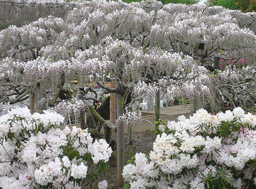 さくら色の藤棚(うすべに藤棚)や庭木仕立てのむらさき藤が満開となり 一番最高の時を迎えております。 ツツジやシャクナゲと共に美しい園内となっております。