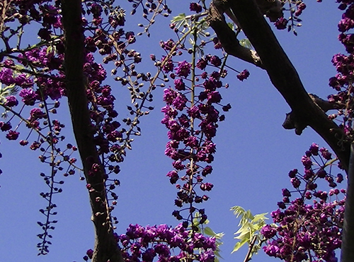 さくら色の藤(うすべに藤)の花房が大変長く伸び、徐々に開花してきました。