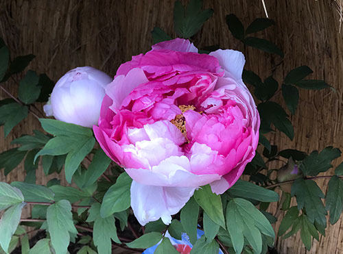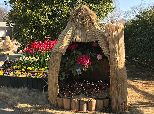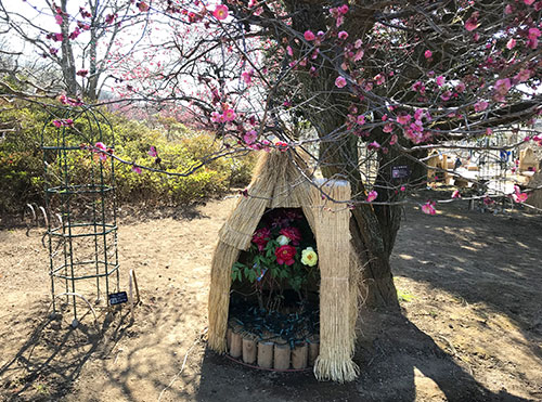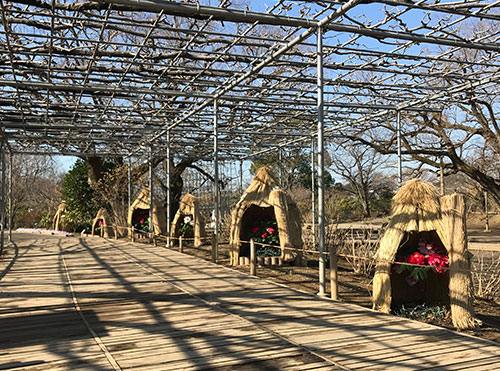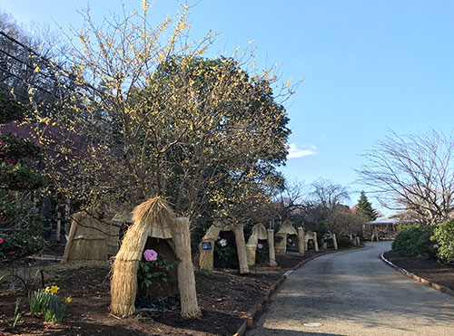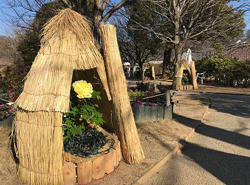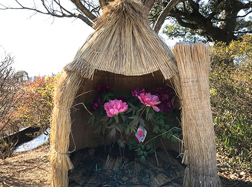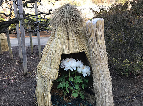 園内にはかわいらしい雪囲いをした冬咲き牡丹がたくさん設置しております。