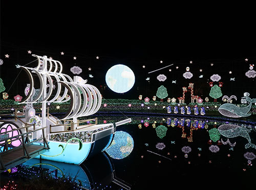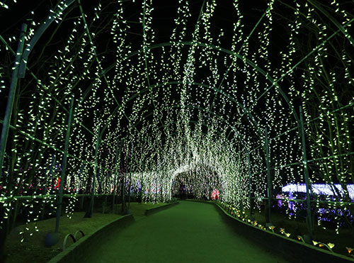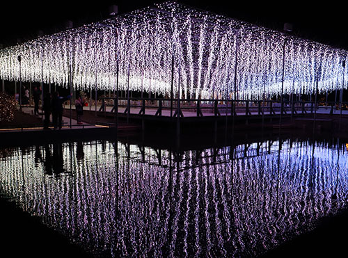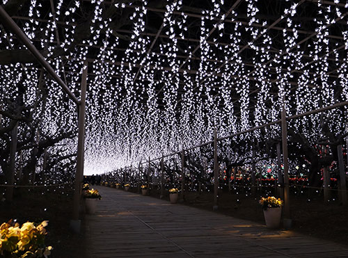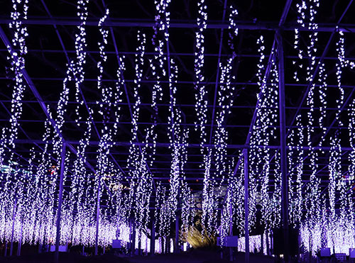 実際に咲く藤は「むらさき」色ですが、イルミネーションだからこそ表現できる、
