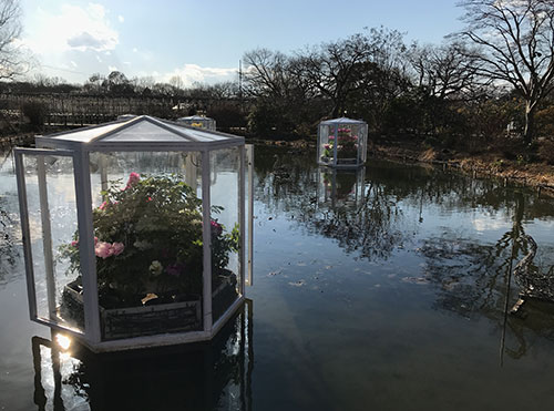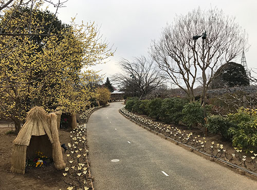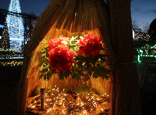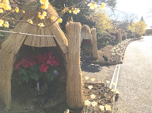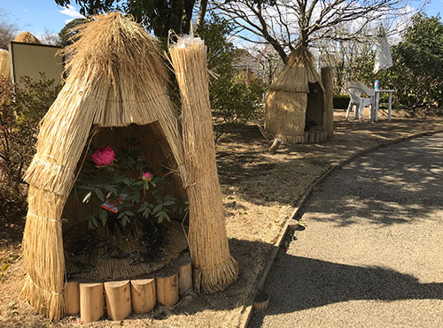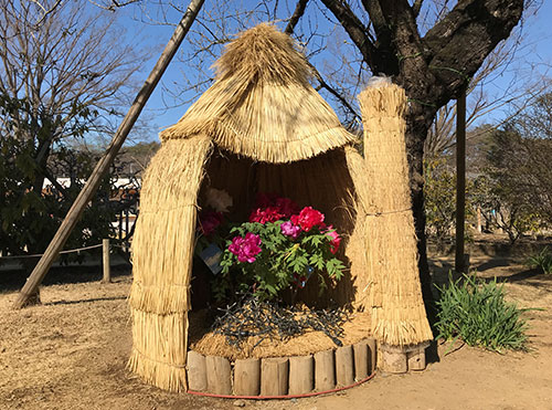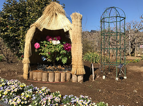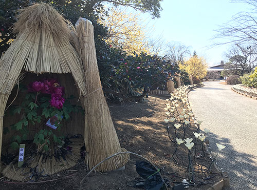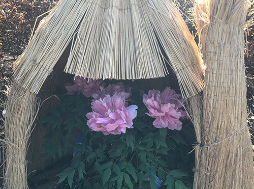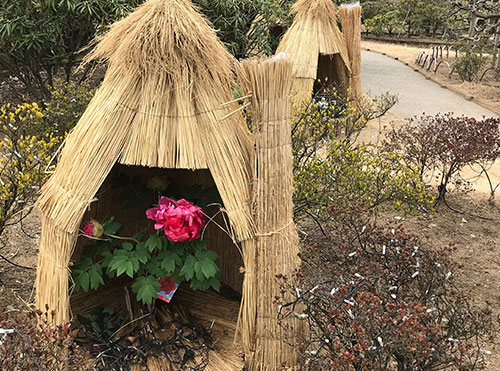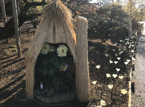 園内にはかわいらしい雪囲いをした冬咲き牡丹がたくさん設置しております。