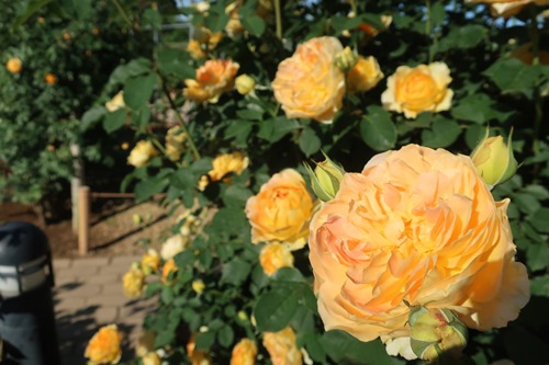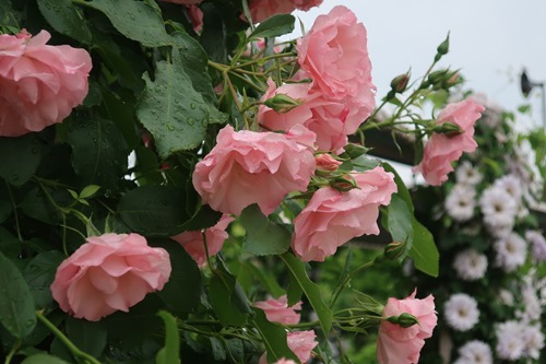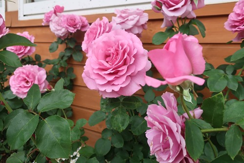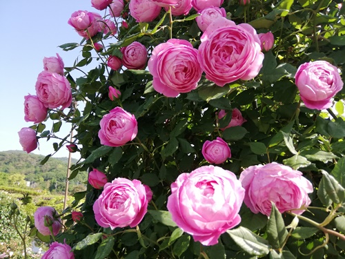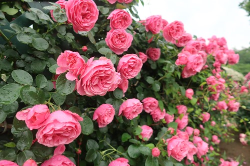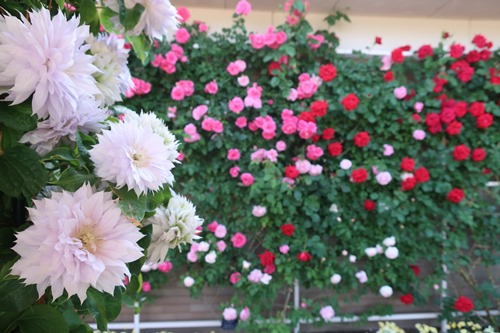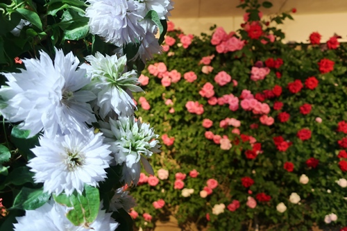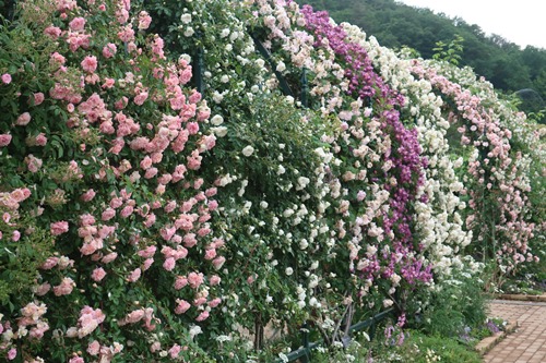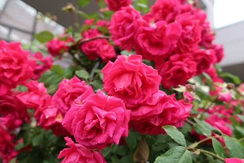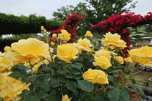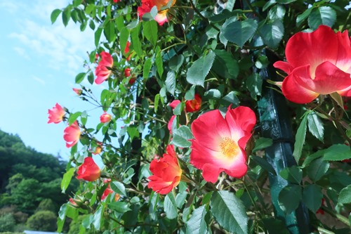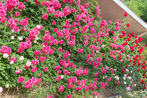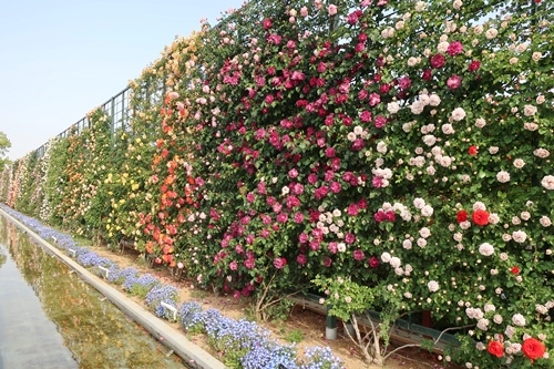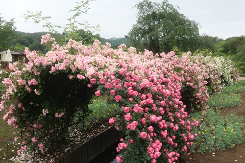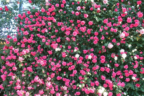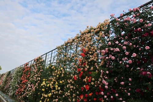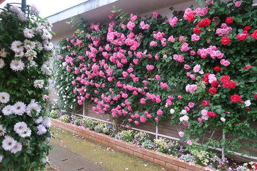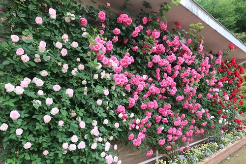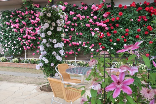 園内南側(山側)の休憩テラス付近に登場した一面バラの壁が満開です。
