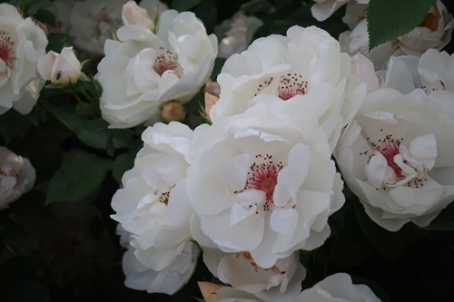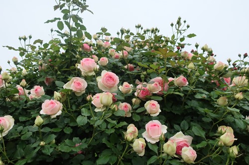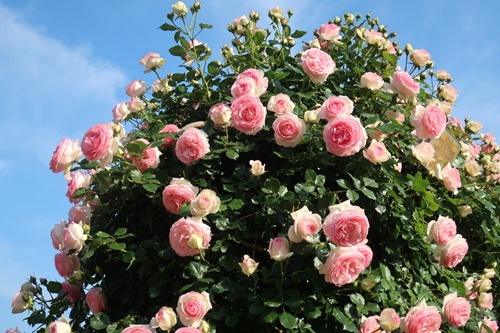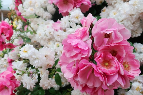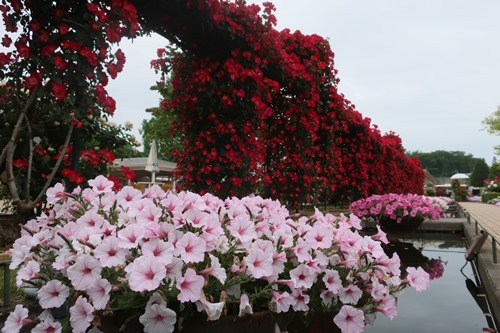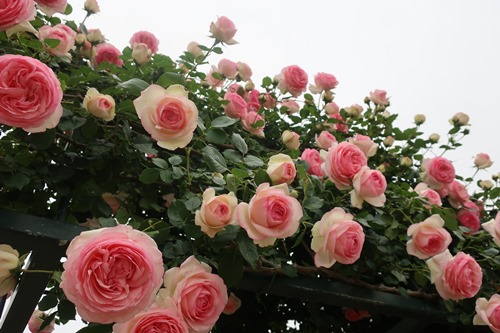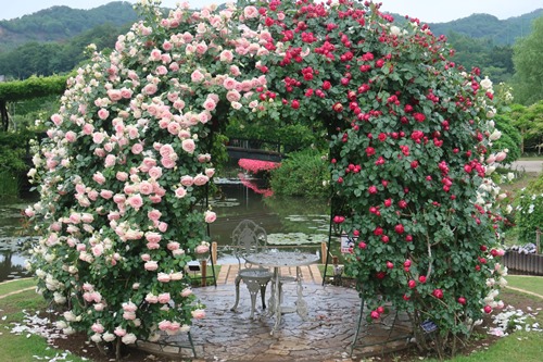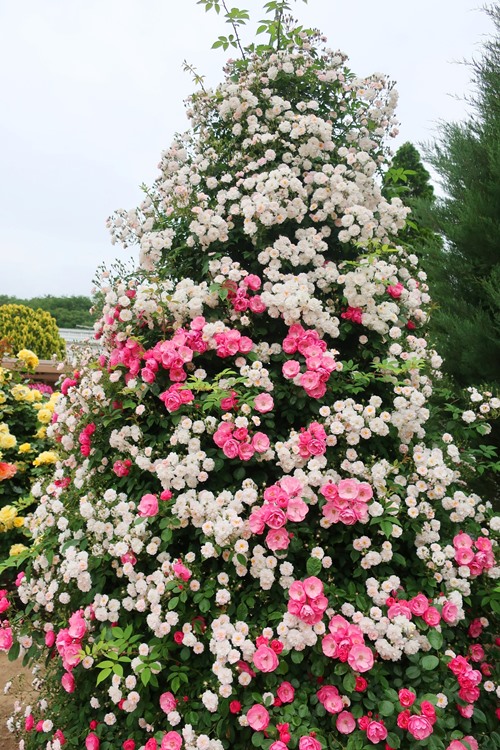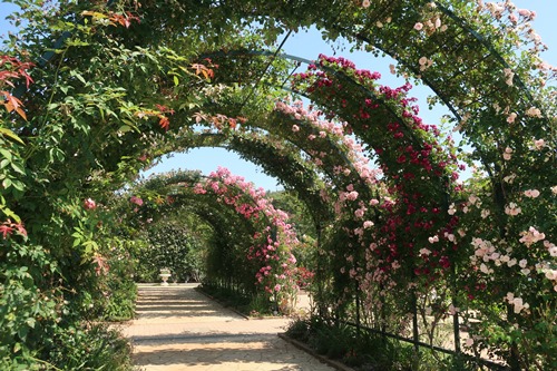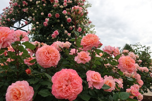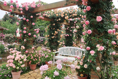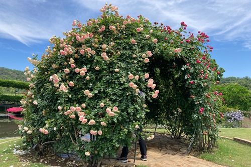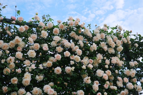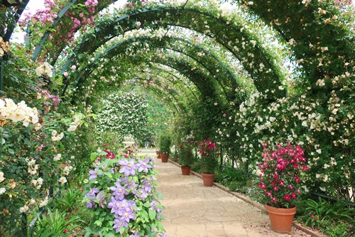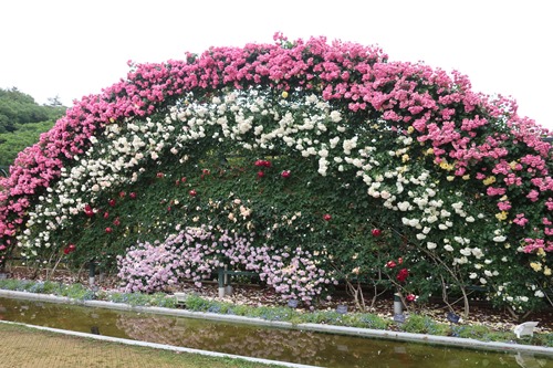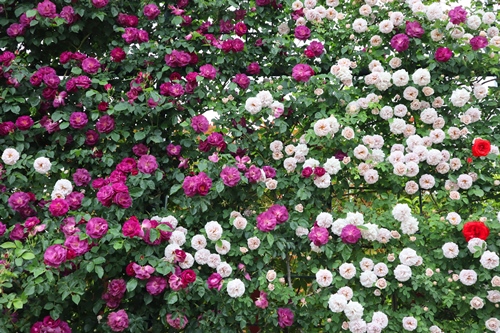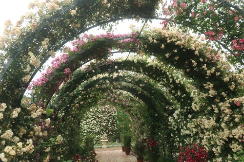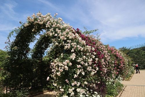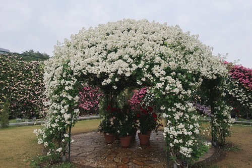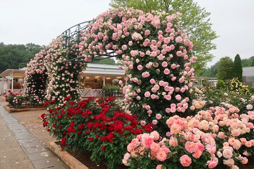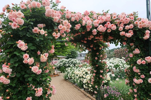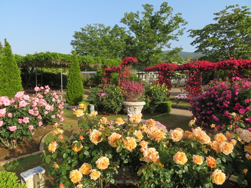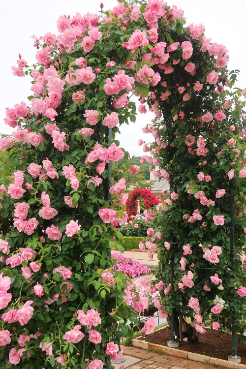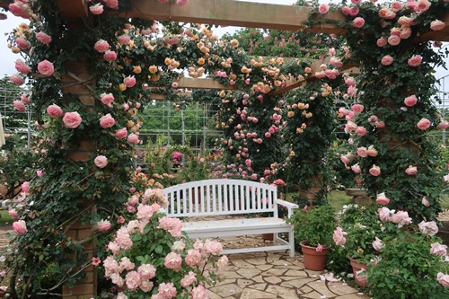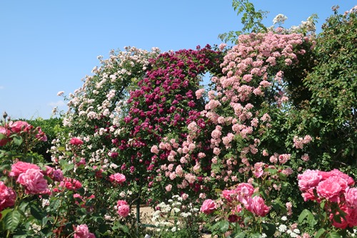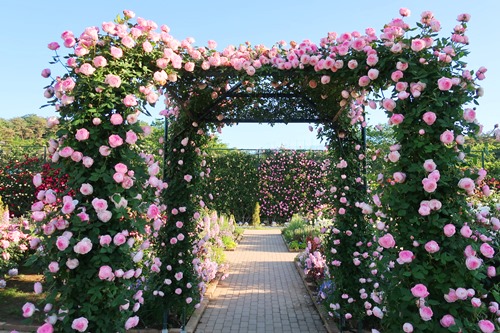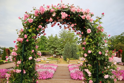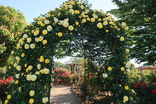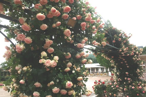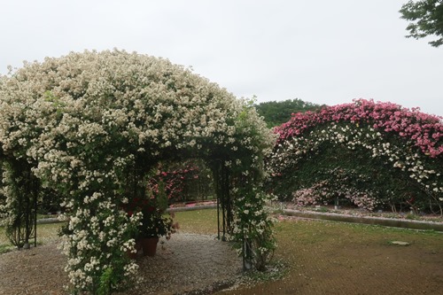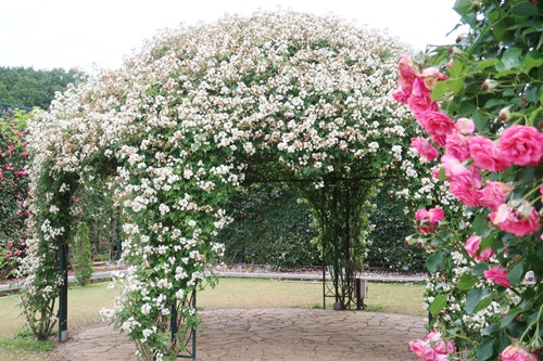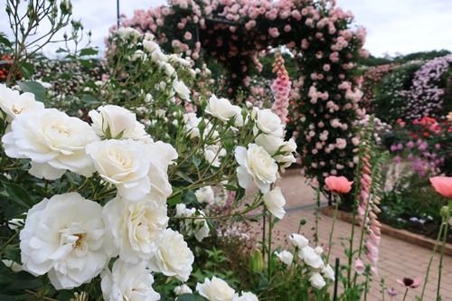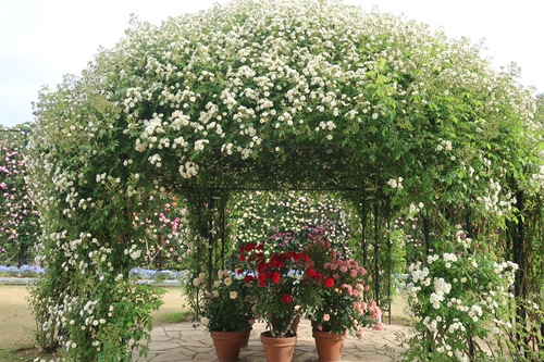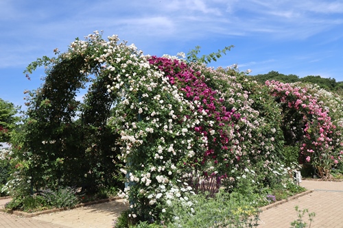 ローズガーデンのガゼボや、虹の壁が満開を迎えています。