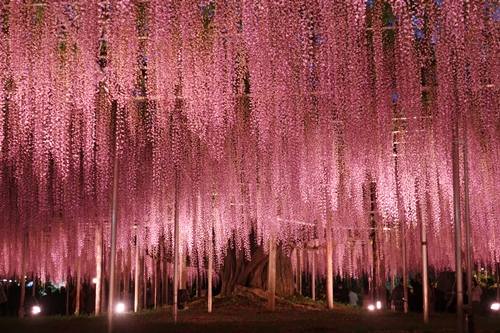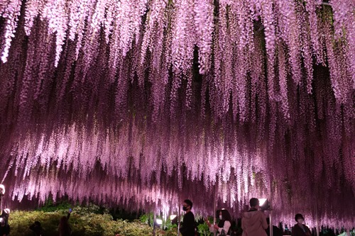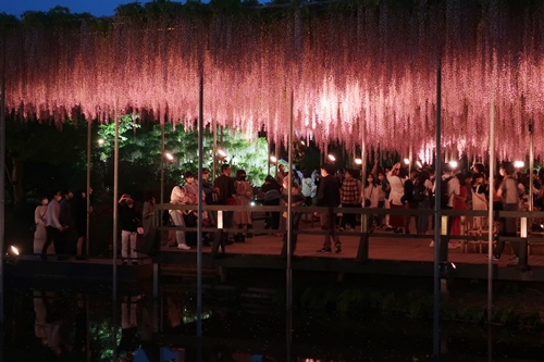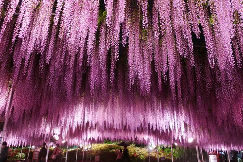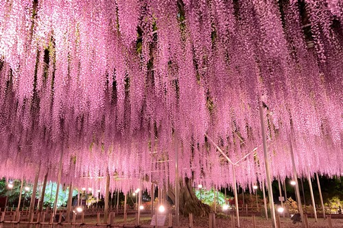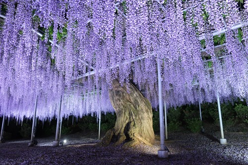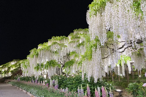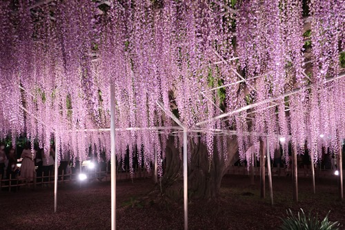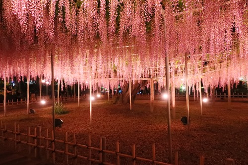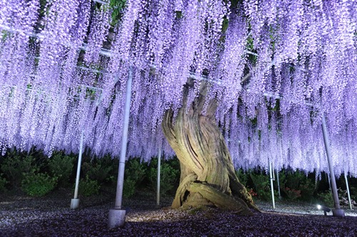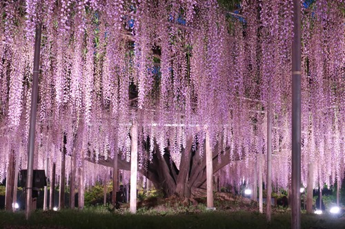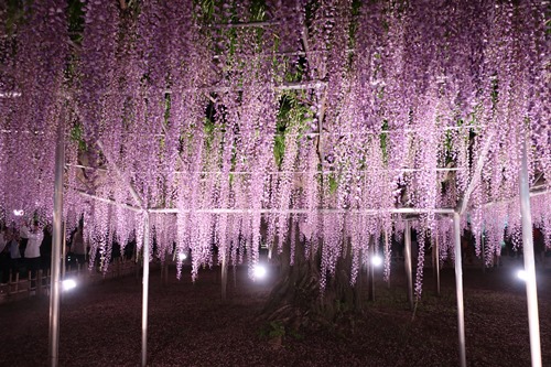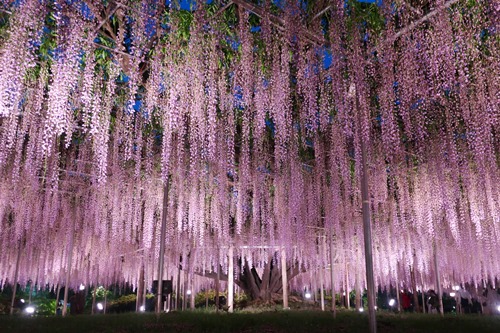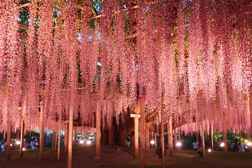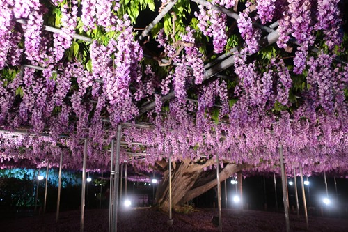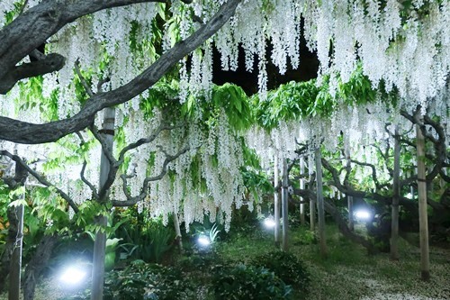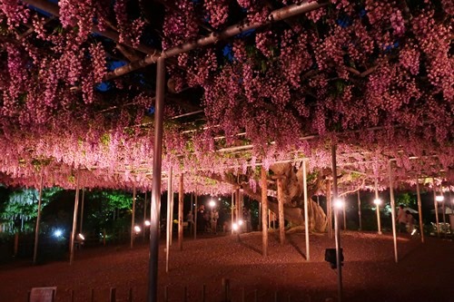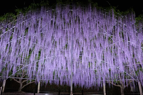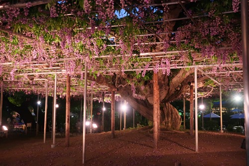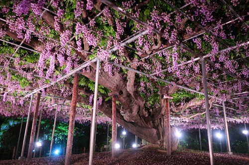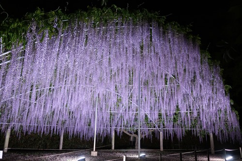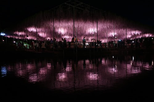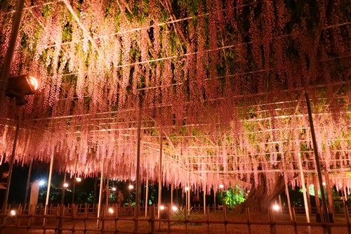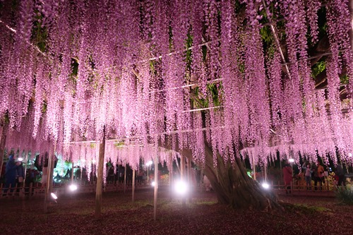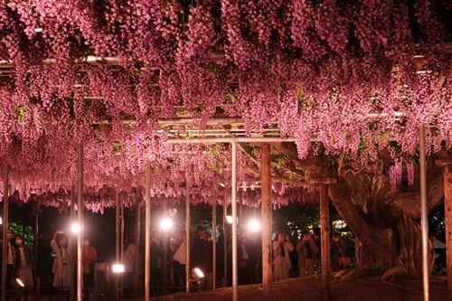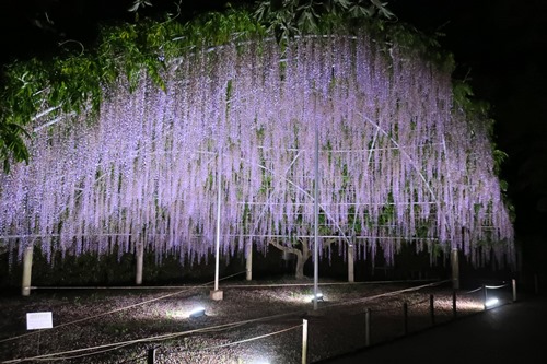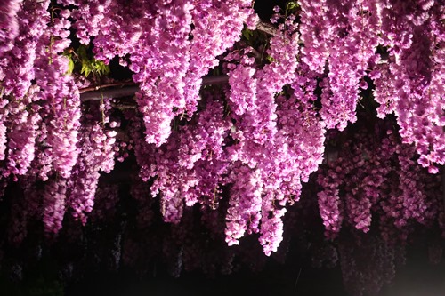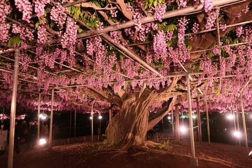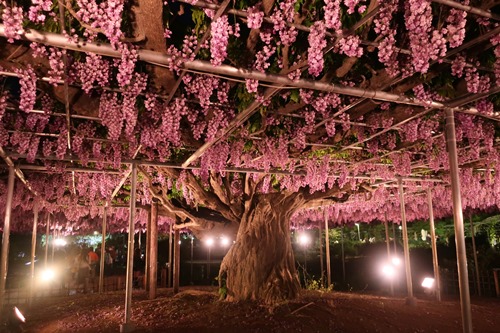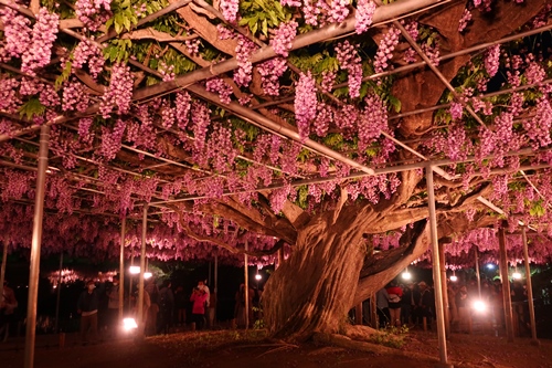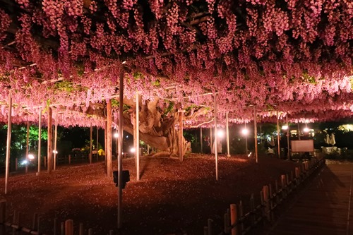 昼間とは全く景色が変わる、ライトアップされた幻想的な藤。