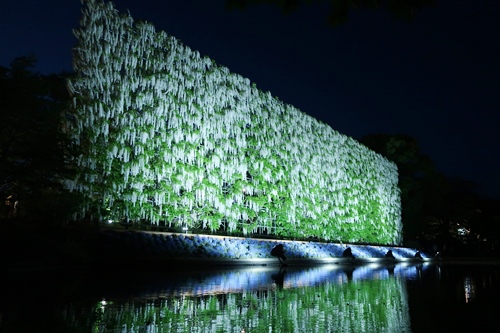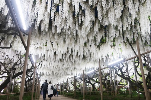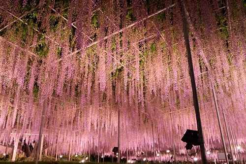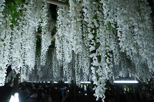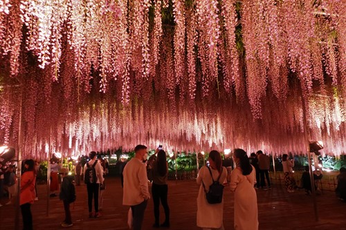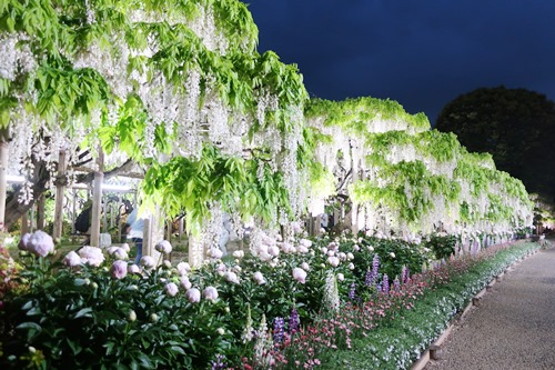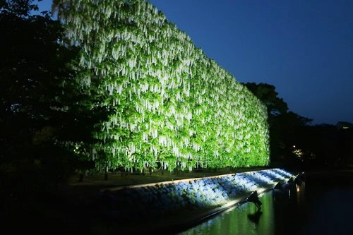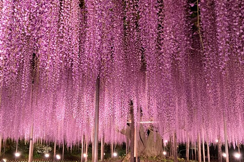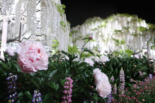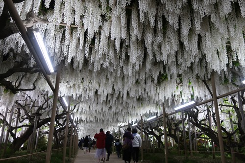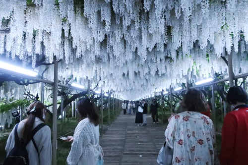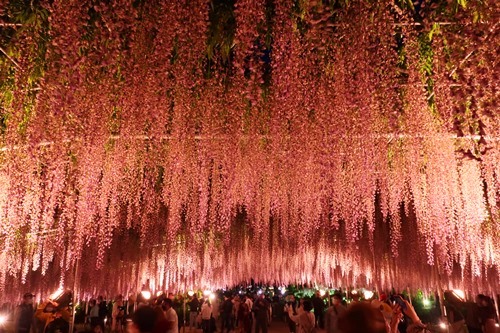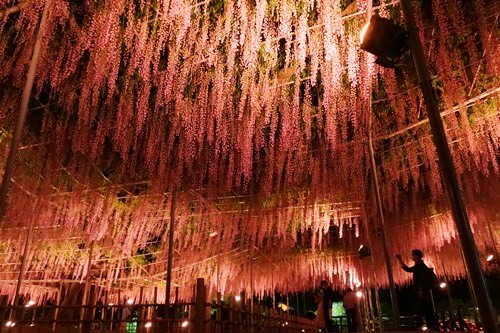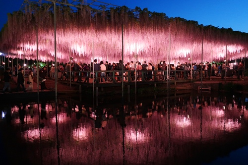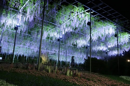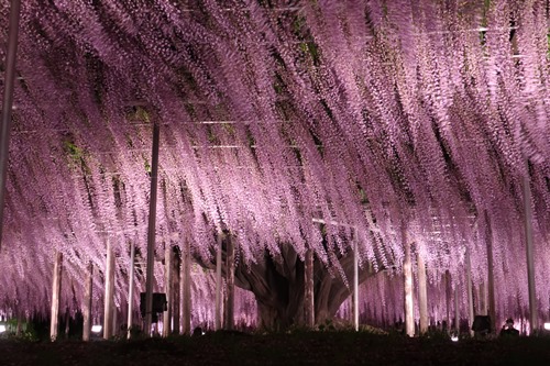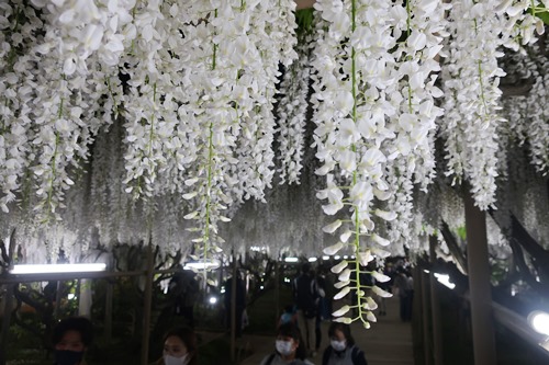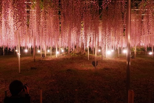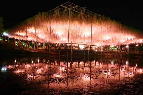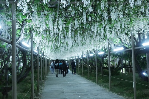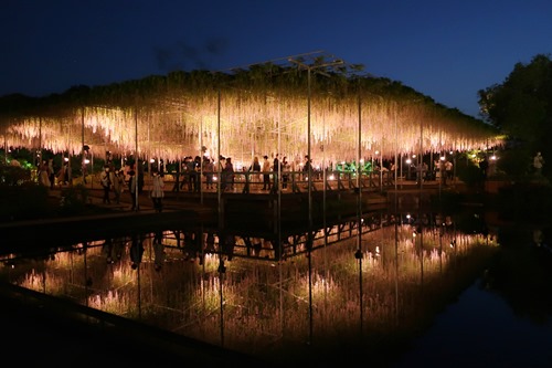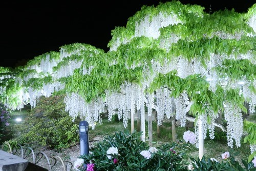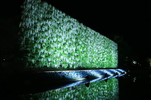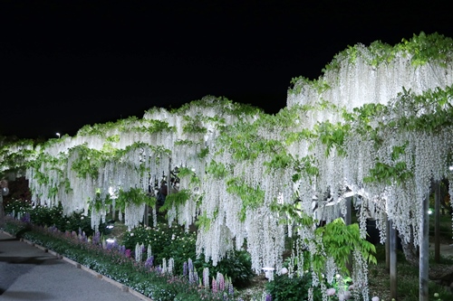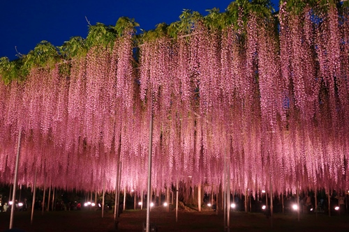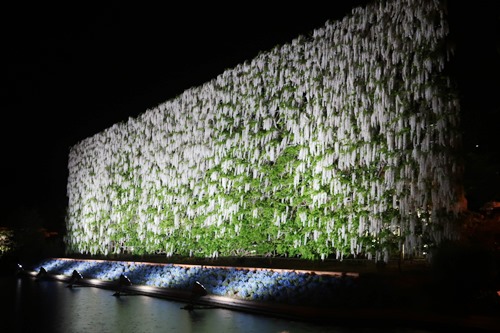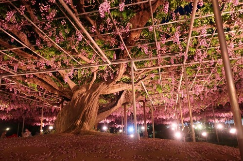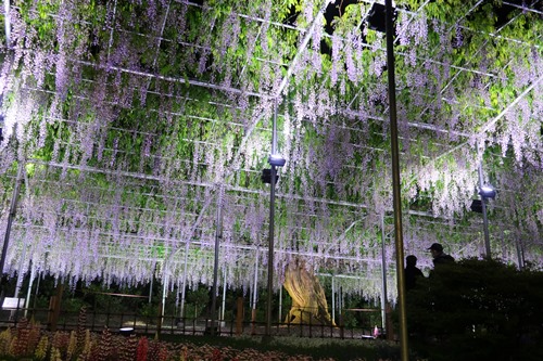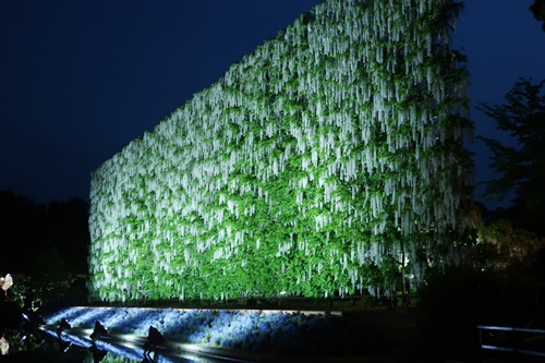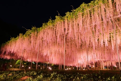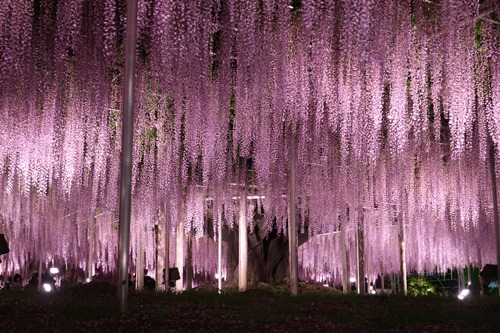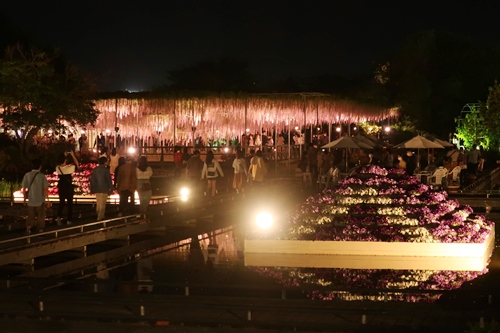 昼間とは全く景色が変わる、ライトアップされた幻想的な藤。