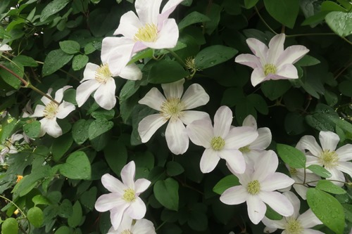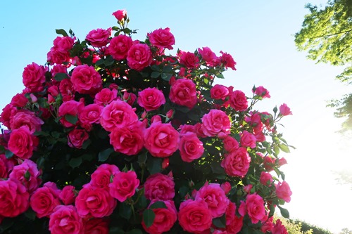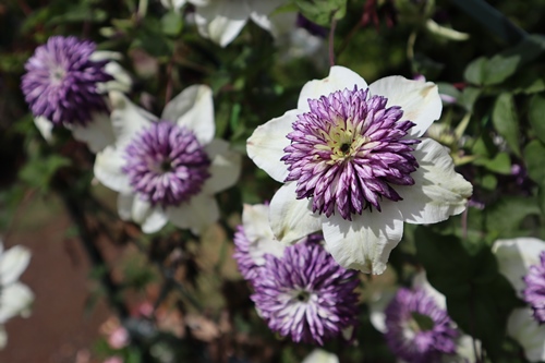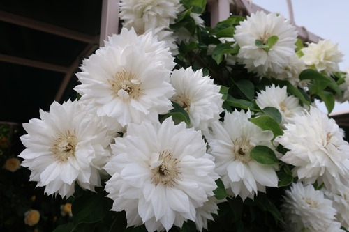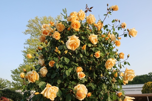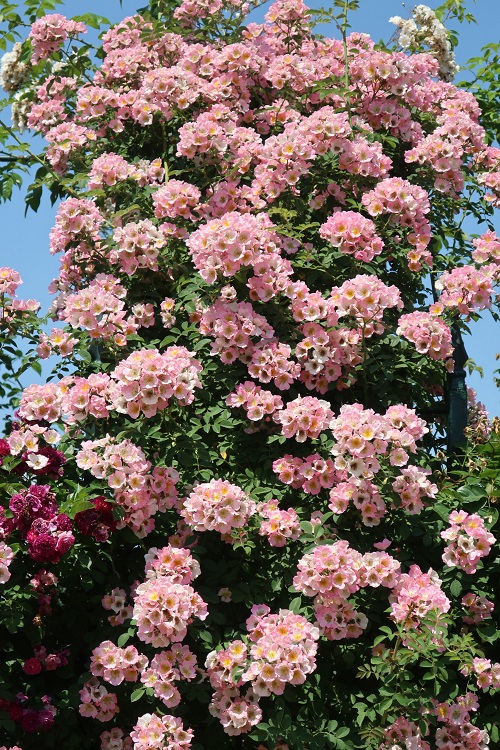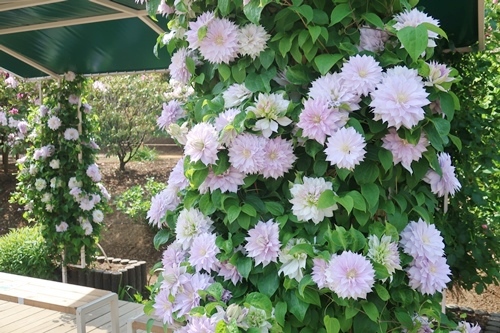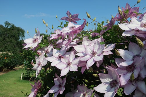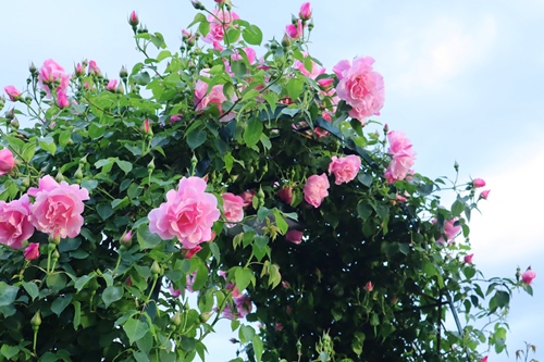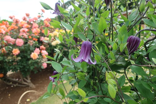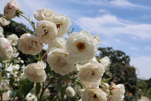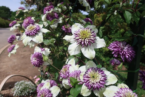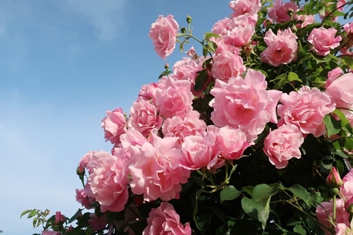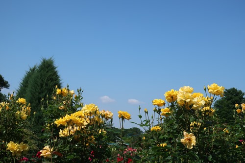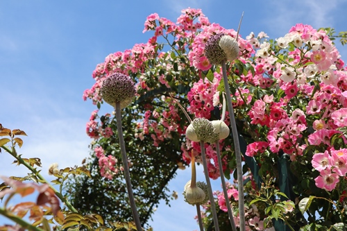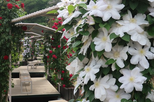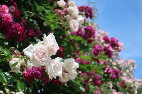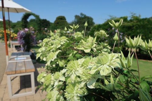 青空に映える花々。バラ・クレマチスの見頃が続いています