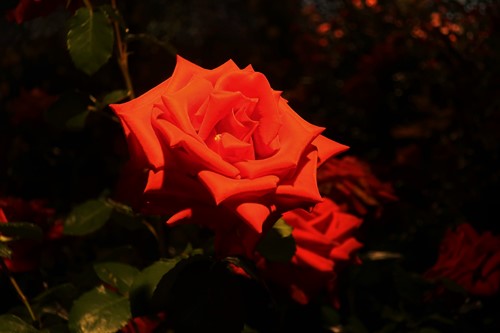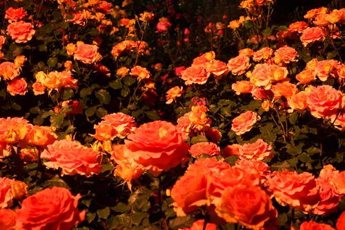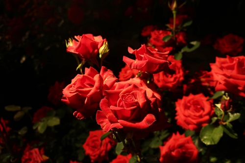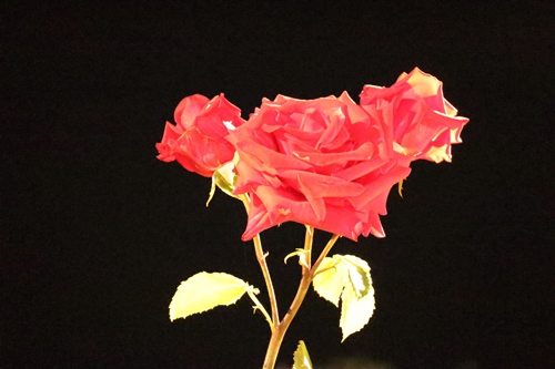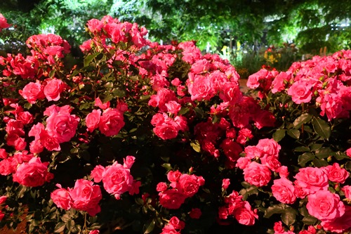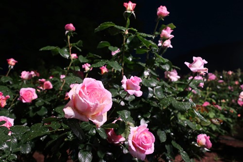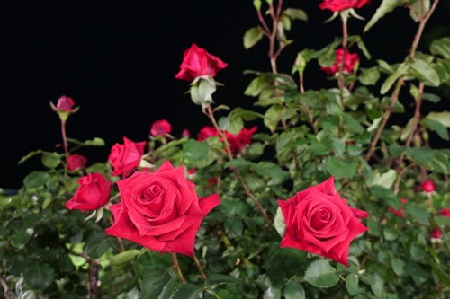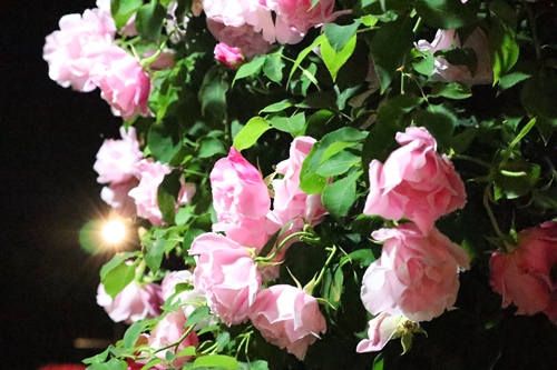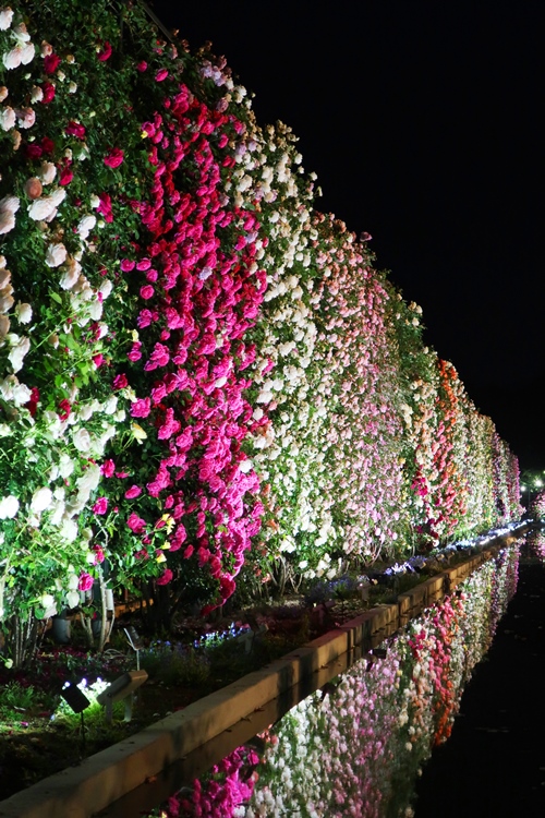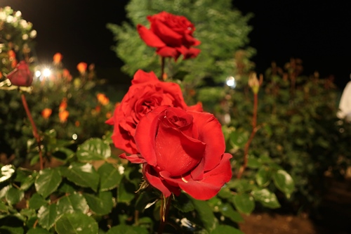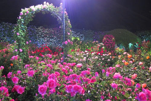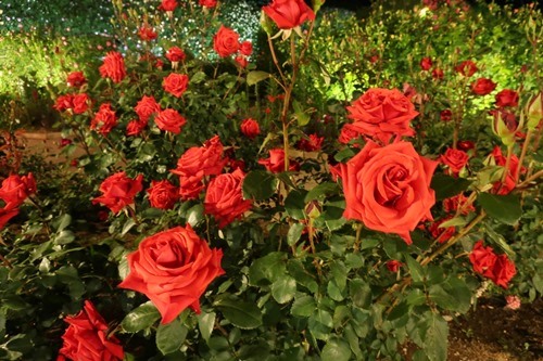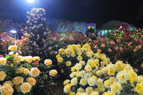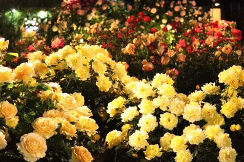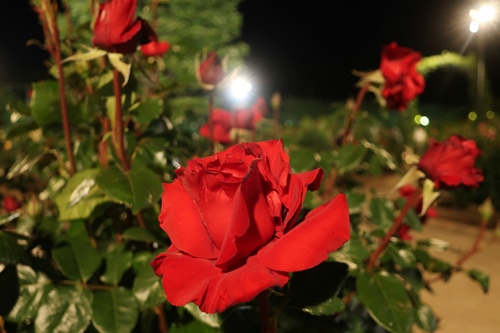 バラが最盛期を迎えています。ライトアップが鮮やかに映えています。