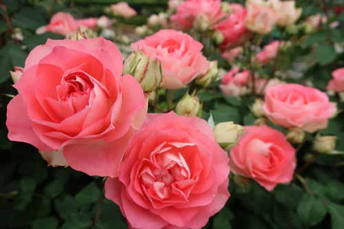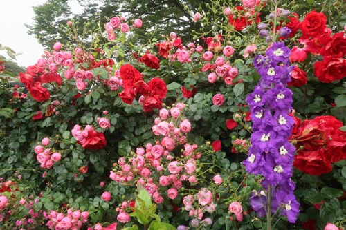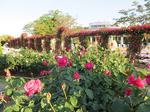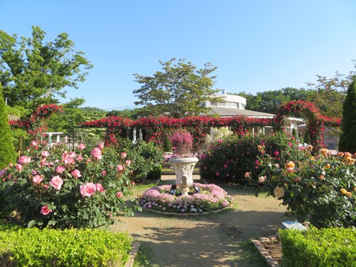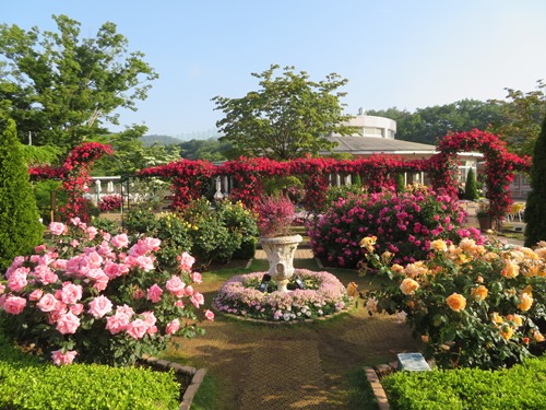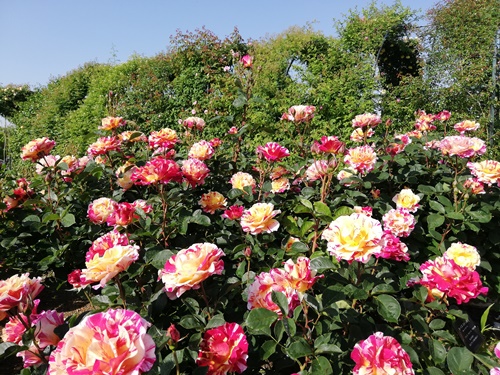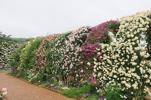 ローズガーデンのガゼボや、虹の壁の見頃が続いております。