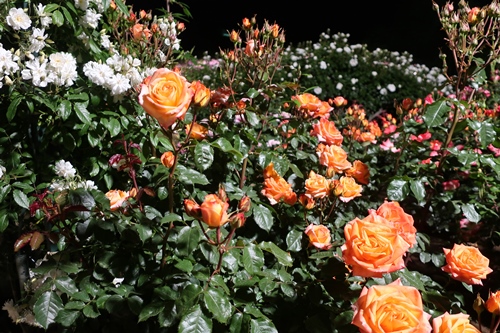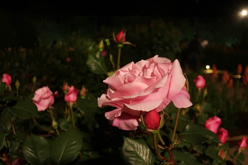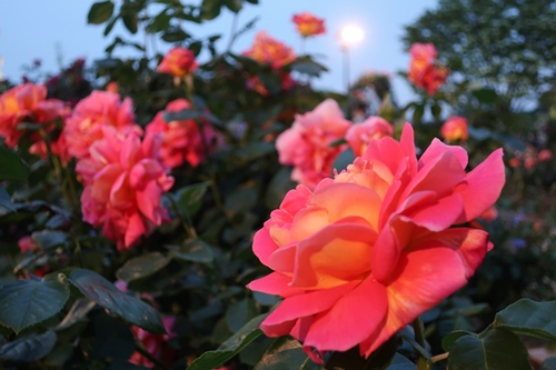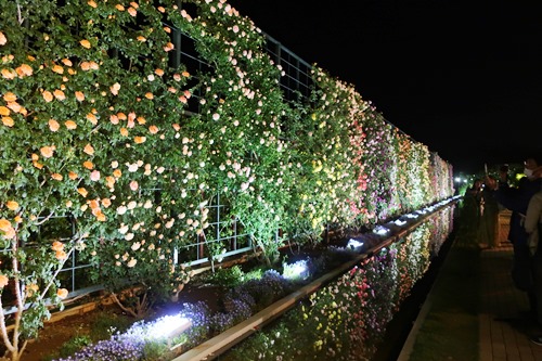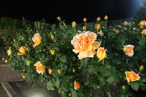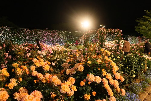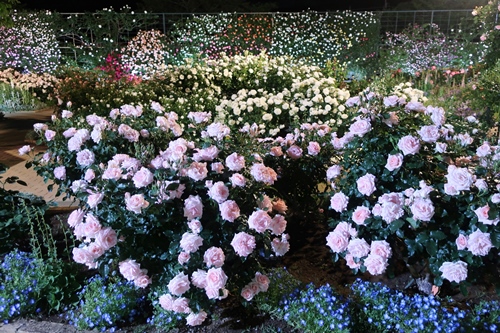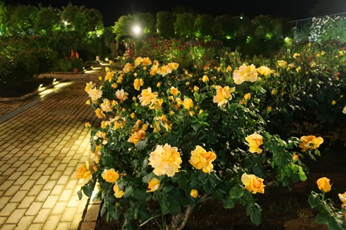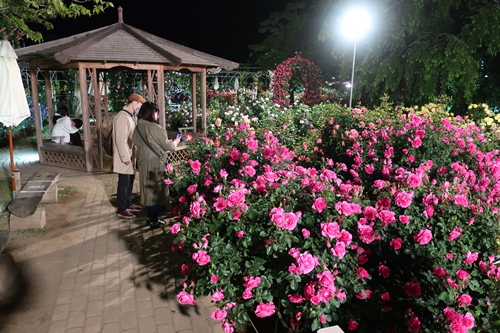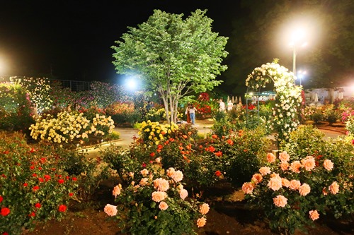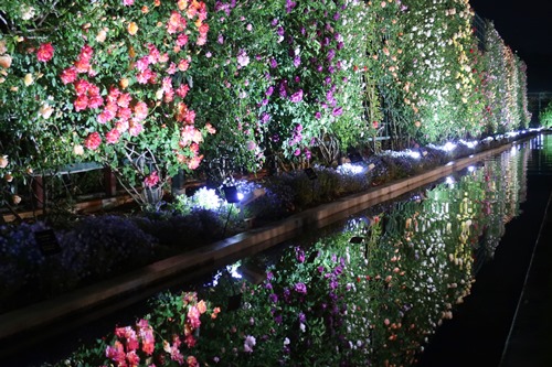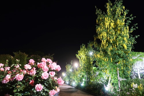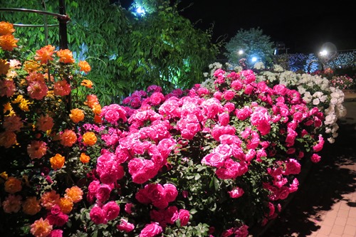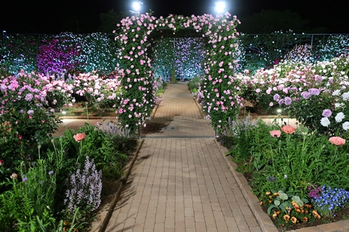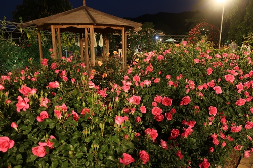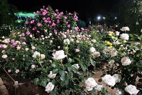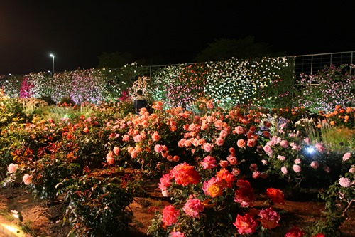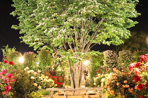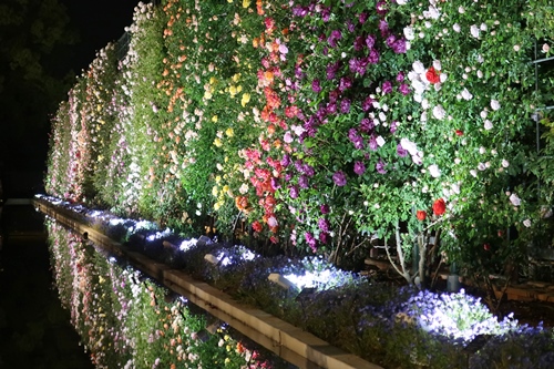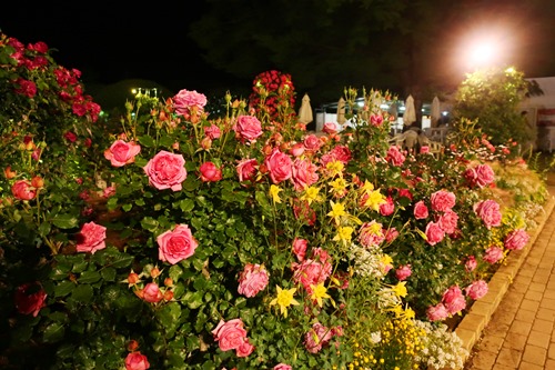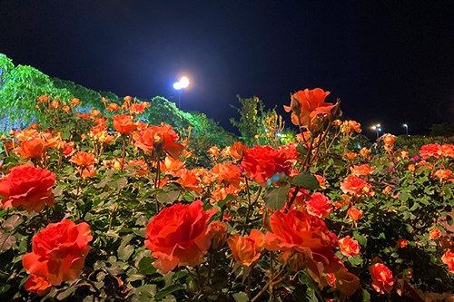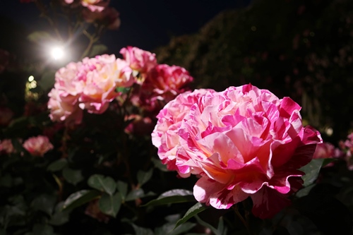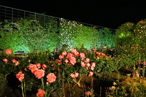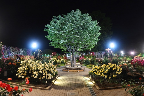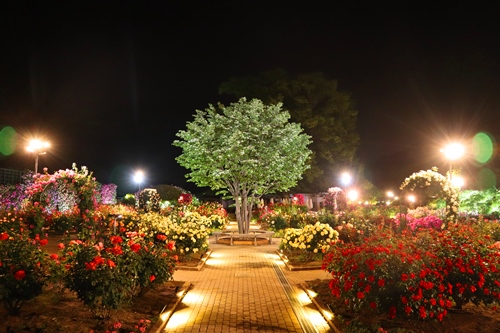 バラも見頃を迎え、ライトアップが鮮やかに映えています。
