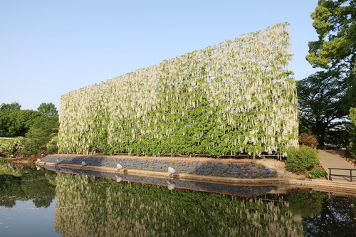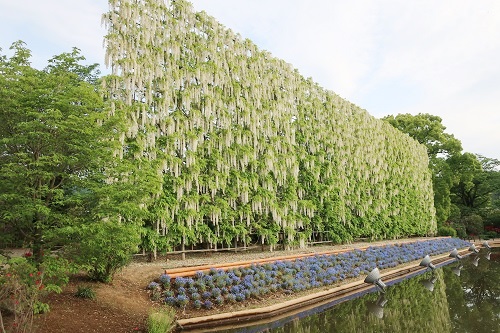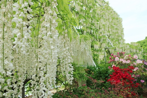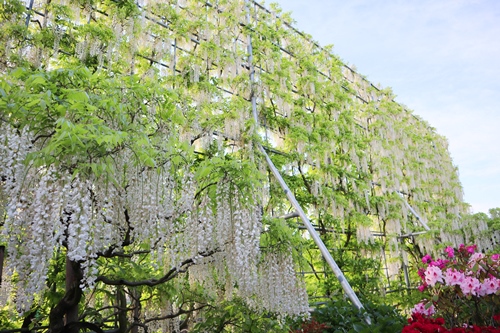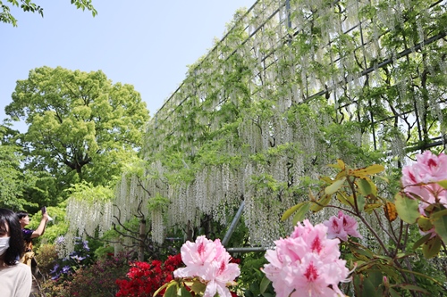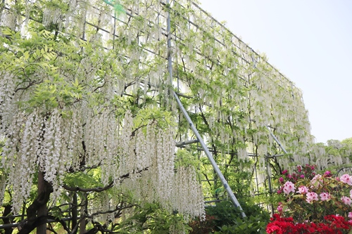 「大藤、白藤、きばな藤」三色の藤の競演をお楽しみください。