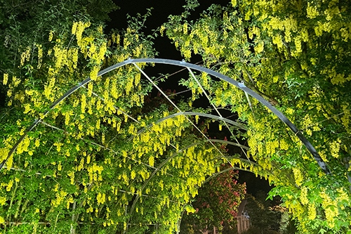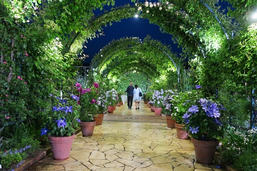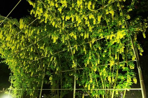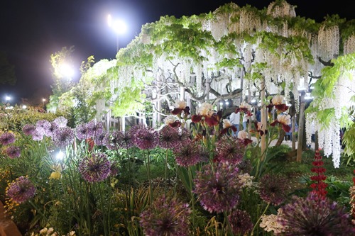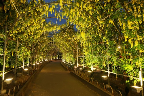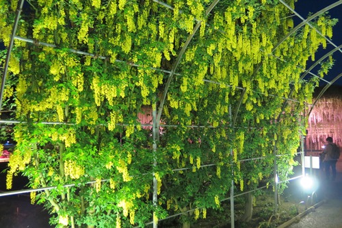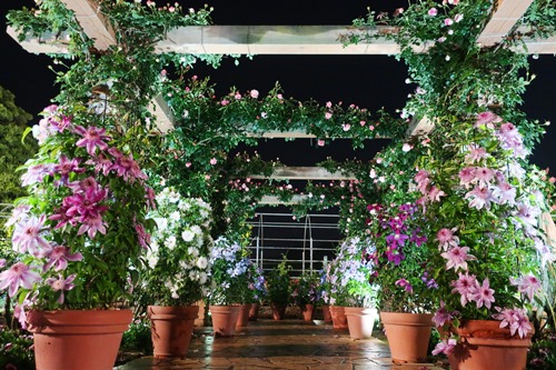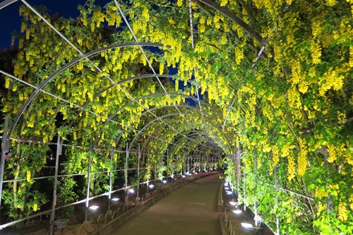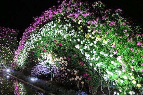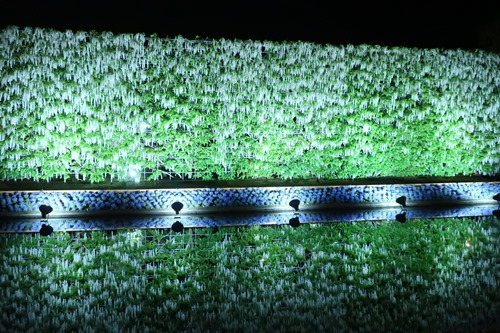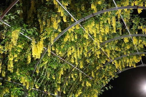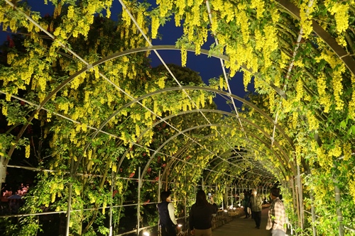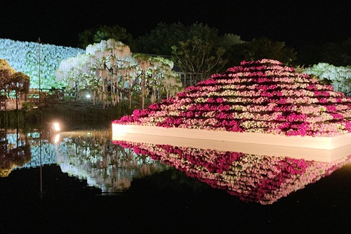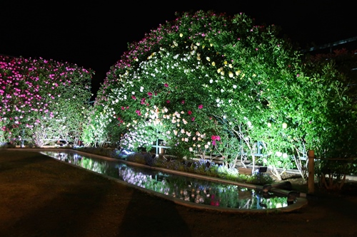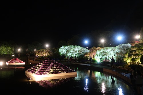 昼間とは全く景色が変わる、ライトアップされた幻想的な花々。