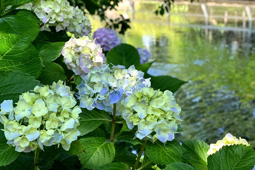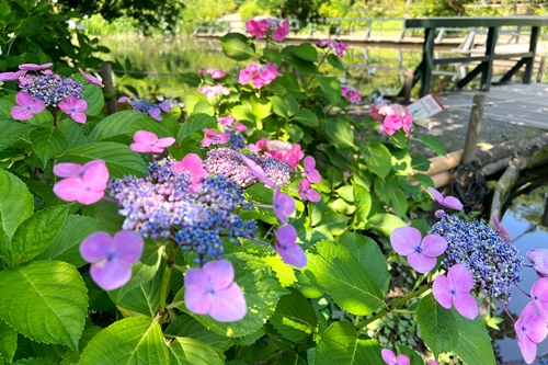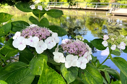 山側水路デッキにてあじさいの展示を6/22(日)頃までご覧いただけます。