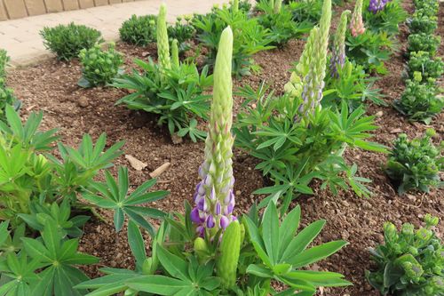 斜めのラインで、外側からアレナリア・オステオスペルマムのピンク・ルピナスの三種類を植栽しています。
