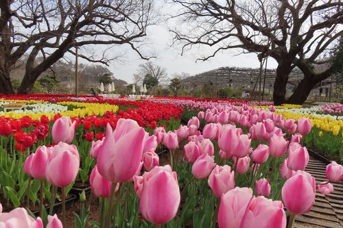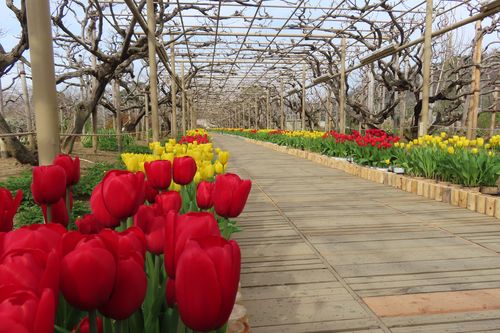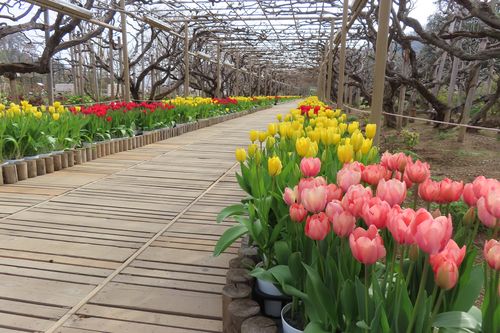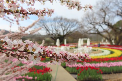 四季彩のステージの西側を向いて写真を撮ると手前にチューリップ、奥にはハクモクレンにサンシュユ、その後ろに梅(白・ピンク)