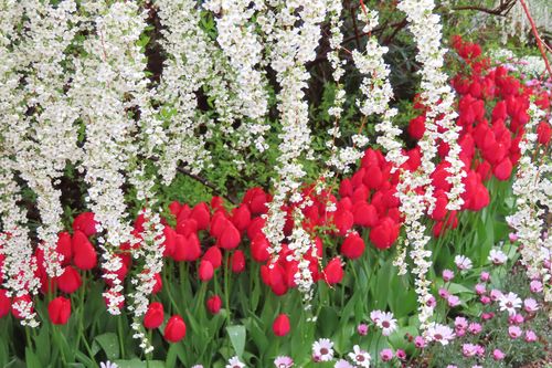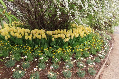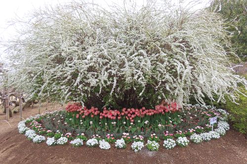 (園内各所のユキヤナギとチューリップ花壇)