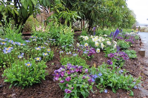 水色のブルーデージーや紫のネメシアなどのブルーの植栽や、