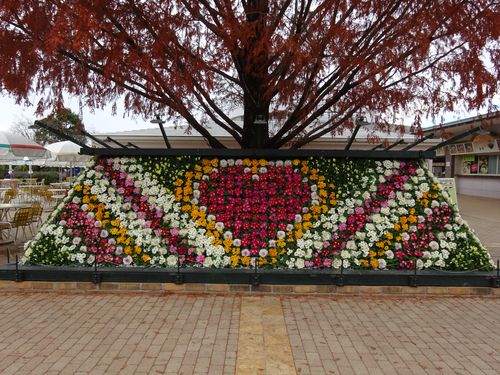 園内へ入ってすぐのメタセコイヤ下にはプリムラやビオラで飾られたハート模様が♡