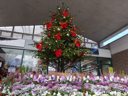 ショッピングハウスの入口では5mを超える大きなクリスマスツリーがお出迎えです。足元をソフトな色合いで彩るのは、ストックや葉ボタンなどのフリルが可愛い植物たちです。