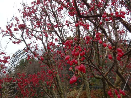 たわわになった赤い実はサンシュユです。つまみ食いしたことがありますが、実はなかなかえぐみが強いです…。しわが入るぐらいならせておくと、甘くなり鳥も食べ始めます。