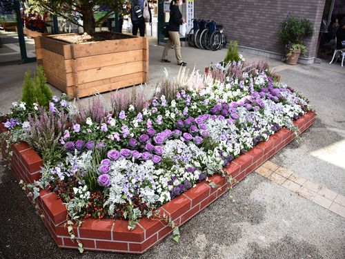 手前の花壇にはハボタンやエリカ、シロタエギクなどで彩られています。