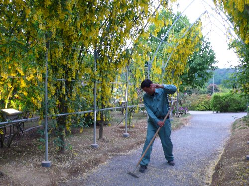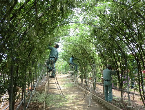 園内のどこから見ても美しい姿を見ていただけるように、一つ一つの作業すべてに思いを込めて一年間お手入れさせていただきました。力強く美しく咲き誇る藤を見ていると、一年の苦労も報われます(T_T)