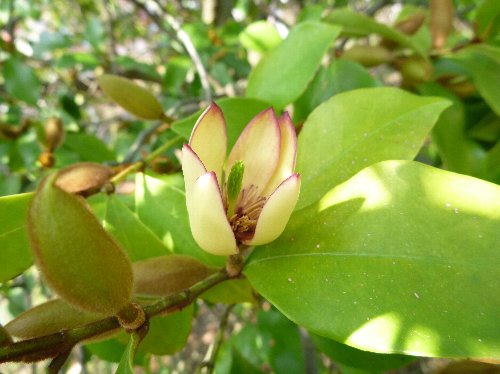 オガタマノキはモクレン科の常緑樹で、園内では半月池のうすべに藤の棚の北側に一本だけ植栽されています。