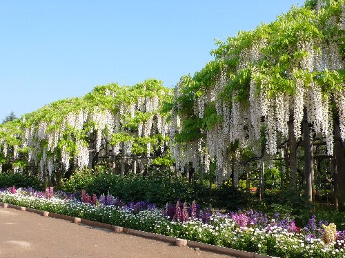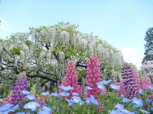 白藤トンネルの中は白一色の世界ですが、外側には白藤を引き立てる様に、カラフルなルピナスやリナリアが控えめながらも可愛らしく咲き合っています(*^^*)