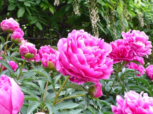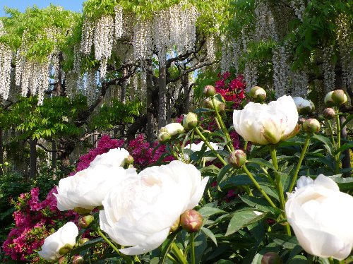 赤と白、2色の八重咲きのシャクヤクが白藤トンネルに華やかさを与えてくれます♪