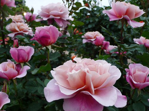 香りの庭…つるバラピースとオレンジ色のバラはリオサンバ!明るく派手な色味がサンバな感じ♪