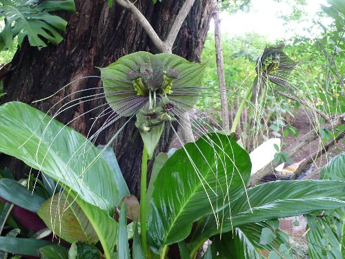 別名バッドフラワーやデビルフラワーとも呼ばれます。猫のひげのような部分は未発達で花にならなかった花茎なんですよ。ちなみに花は真ん中で星のように咲いてるところ、花びらのような緑色の部分は花を包むように付く苞葉と呼ばれる部分です(^^)