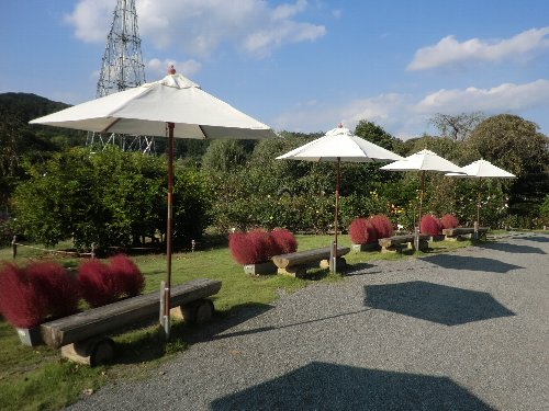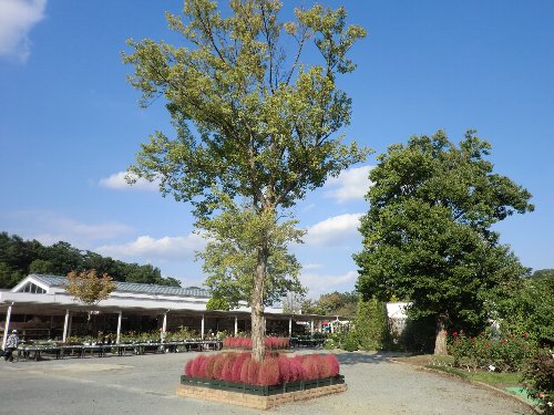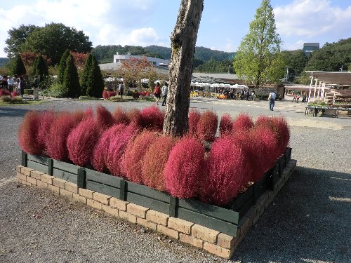 園内に入ってすぐのトウカエデの下には身を寄せ合って、水路沿いから西へ向かってのベンチの傍らには小グループで皆様をお出迎えしています。コキアは朝晩の冷え込みで日に日に赤色に染まりました。
