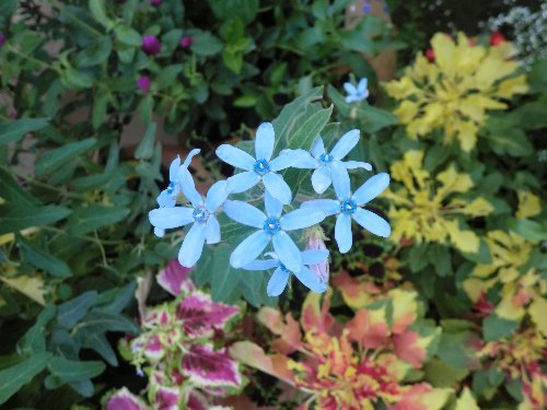 こちらは夏から長くきれいなブルースター。株はひょろひょろしていてもスカイブルーの可愛い花を絶え間なく咲かせてくれています。寄せ植えや花壇の一部にひそんでいます。