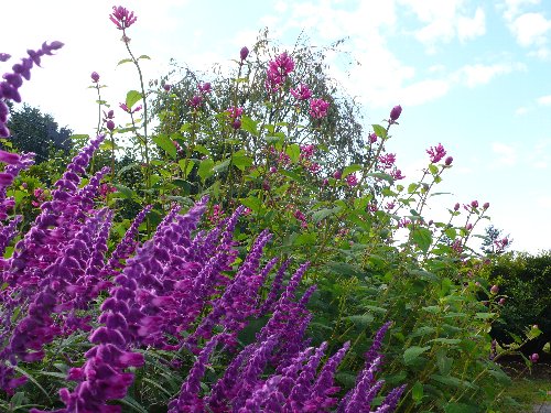 ローズリーフセージとアメジスト♪台風対策でネットを張ったり誘引したおかげで、無事きれいな花が楽しめています(^^)