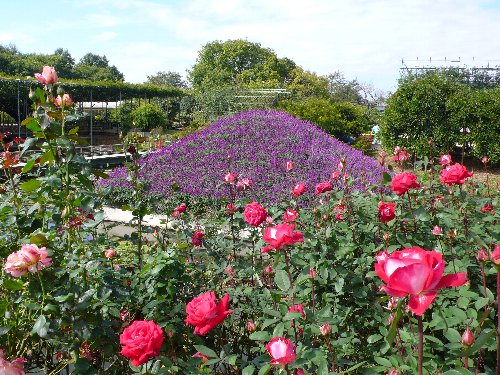 ここから山手の園路を進んでいくとアメジストセージとローズリーフがお待ちしております。