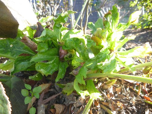 こちらは枯葉の中から花芽を覗かせるクリスマスローズ♪