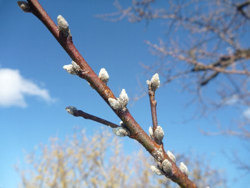 こちらはハナモモの冬芽です。園内のフラワーステージから南側の散策路に植栽されています。
