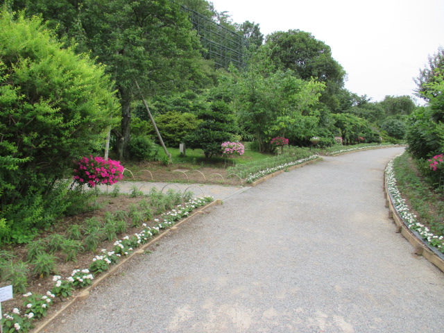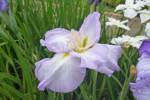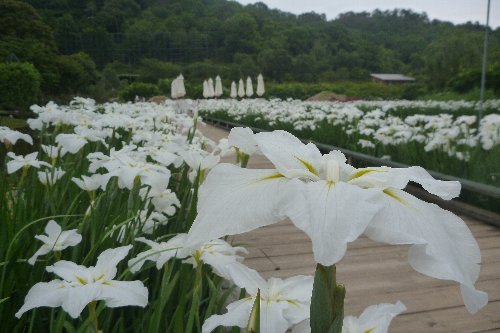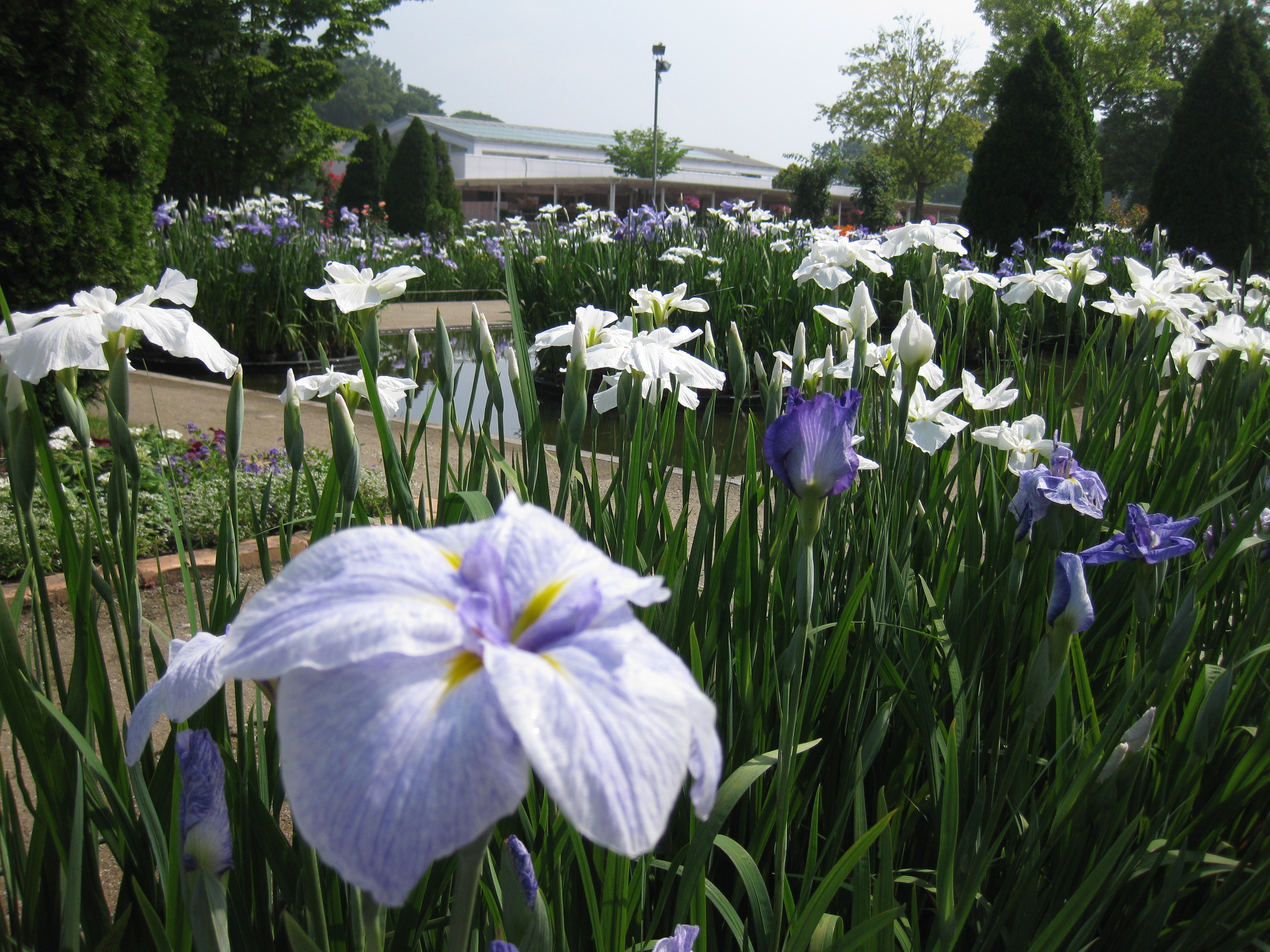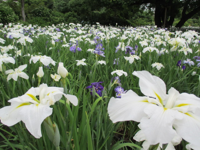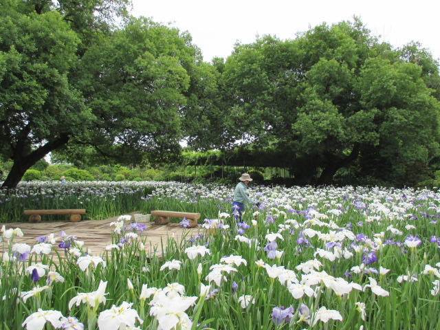ブルー&ホワイトガーデンがテーマの園内では、白と青系の花菖蒲があちこちに咲いています。