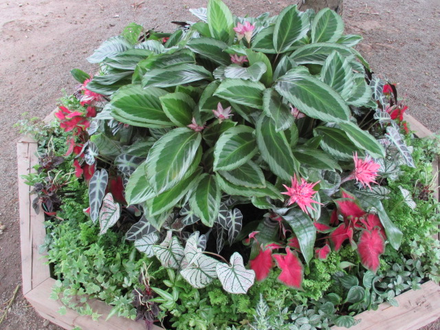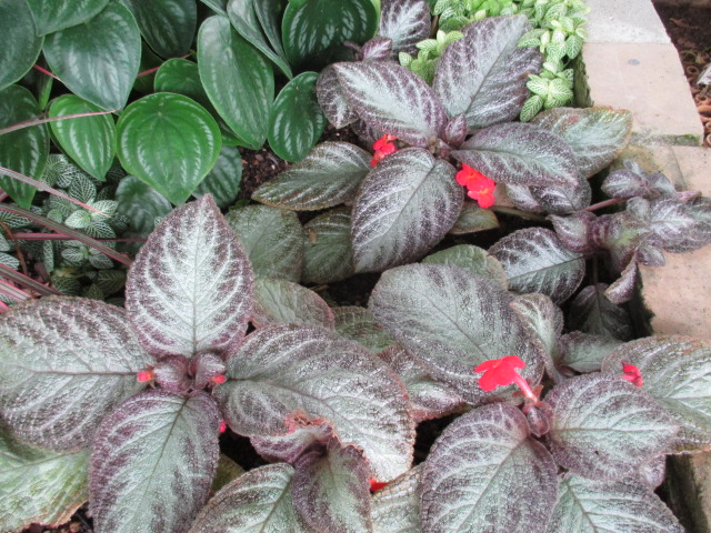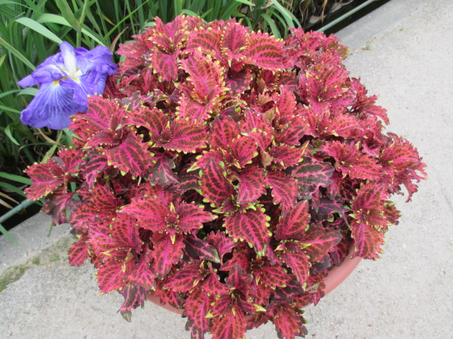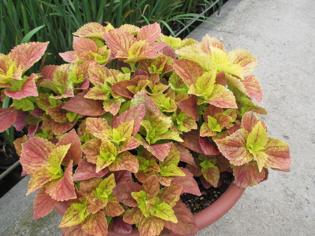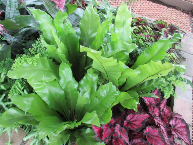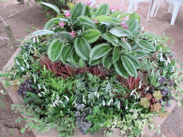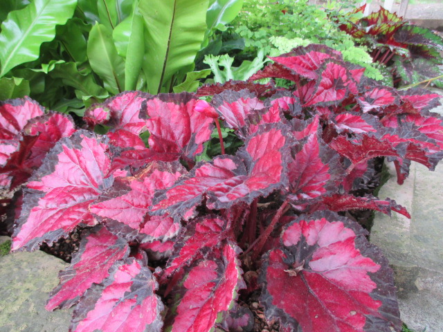 薄紅棚の下の日蔭花壇にはレックスベゴニアやアビス、エビスシア