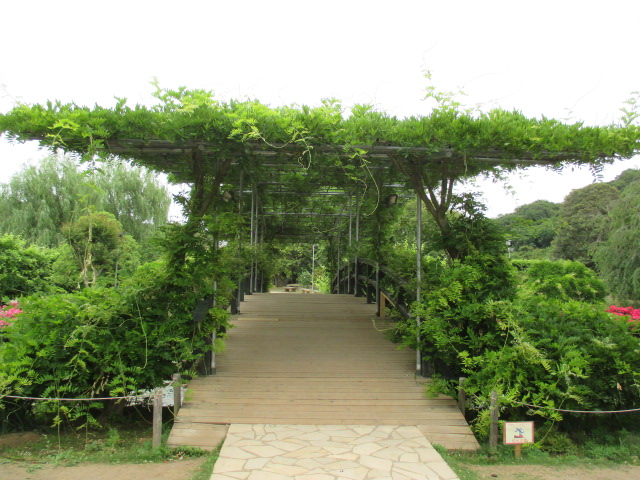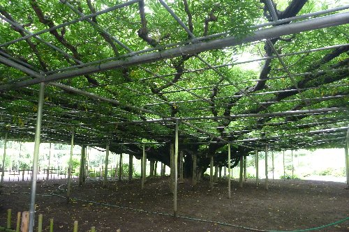 棚の上部に、春から伸びたつるが覆いかぶさり、曇りや雨で日照時間が少なくなると、藤は日当たりの悪い部分の葉を自ら落とします。