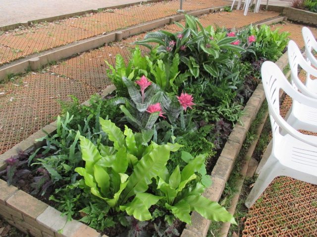 各所の日蔭には観葉植物の花壇やディスプレイもあり、涼しさを演出中。