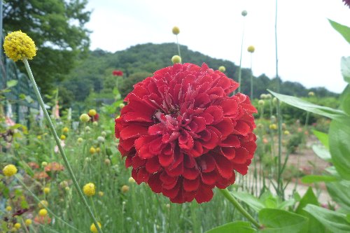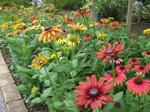 一重の花はエキナセア、八重のシックな花色のはルドベキアのサハラ。一つ一つの花の顔を見るのが楽しい花壇になりました♪