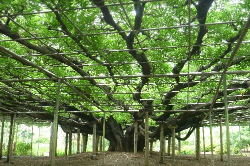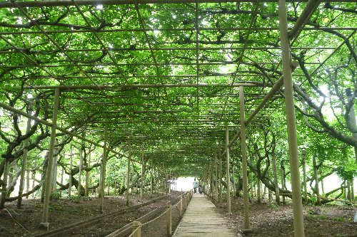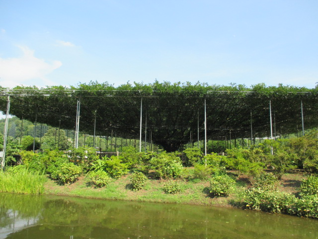 左右合わせて25本の藤が作りだす、長さ50mのトンネルは、5月には真っ白な世界を見せてくれましたが、夏は緑のトンネルになります。