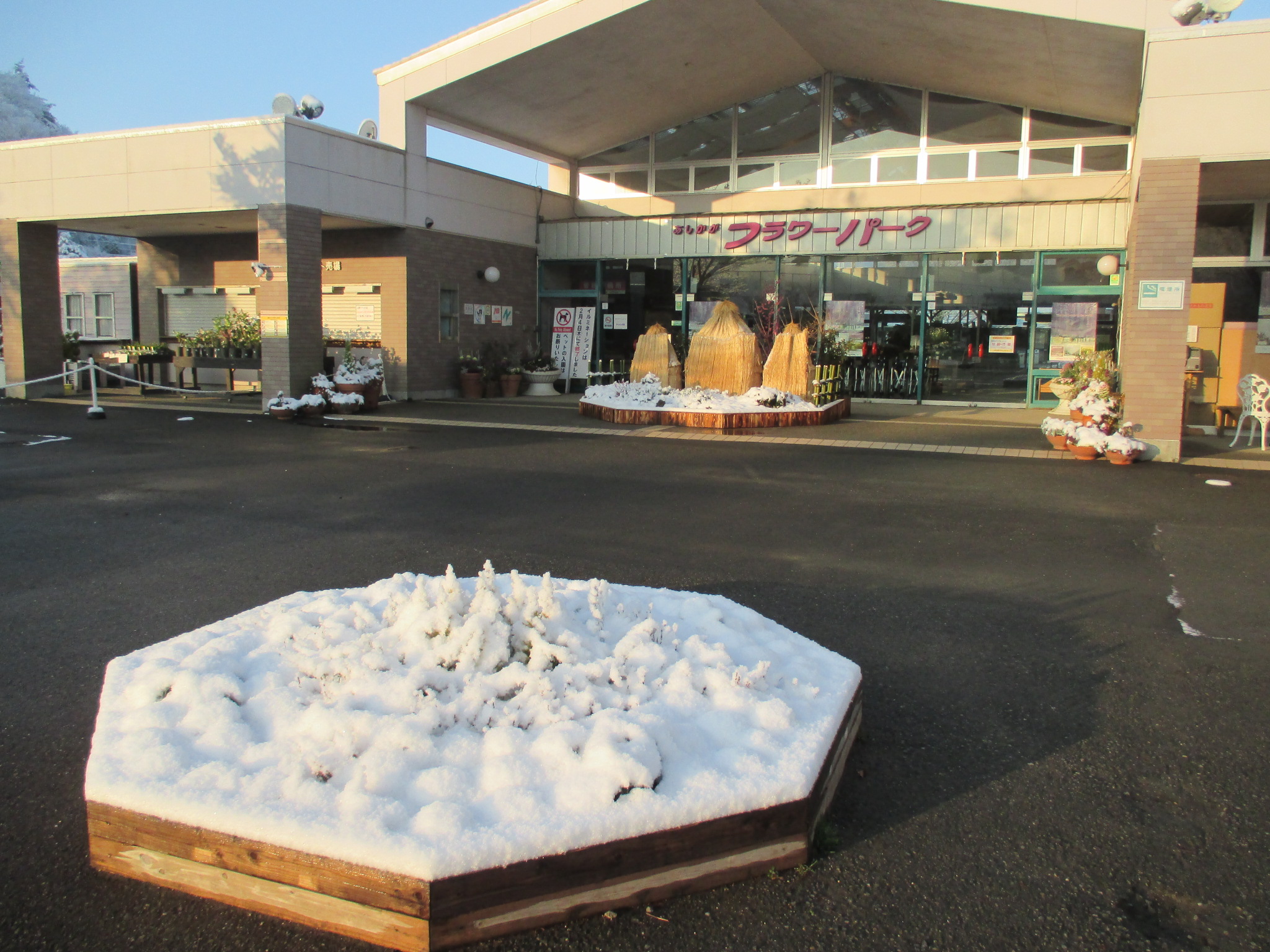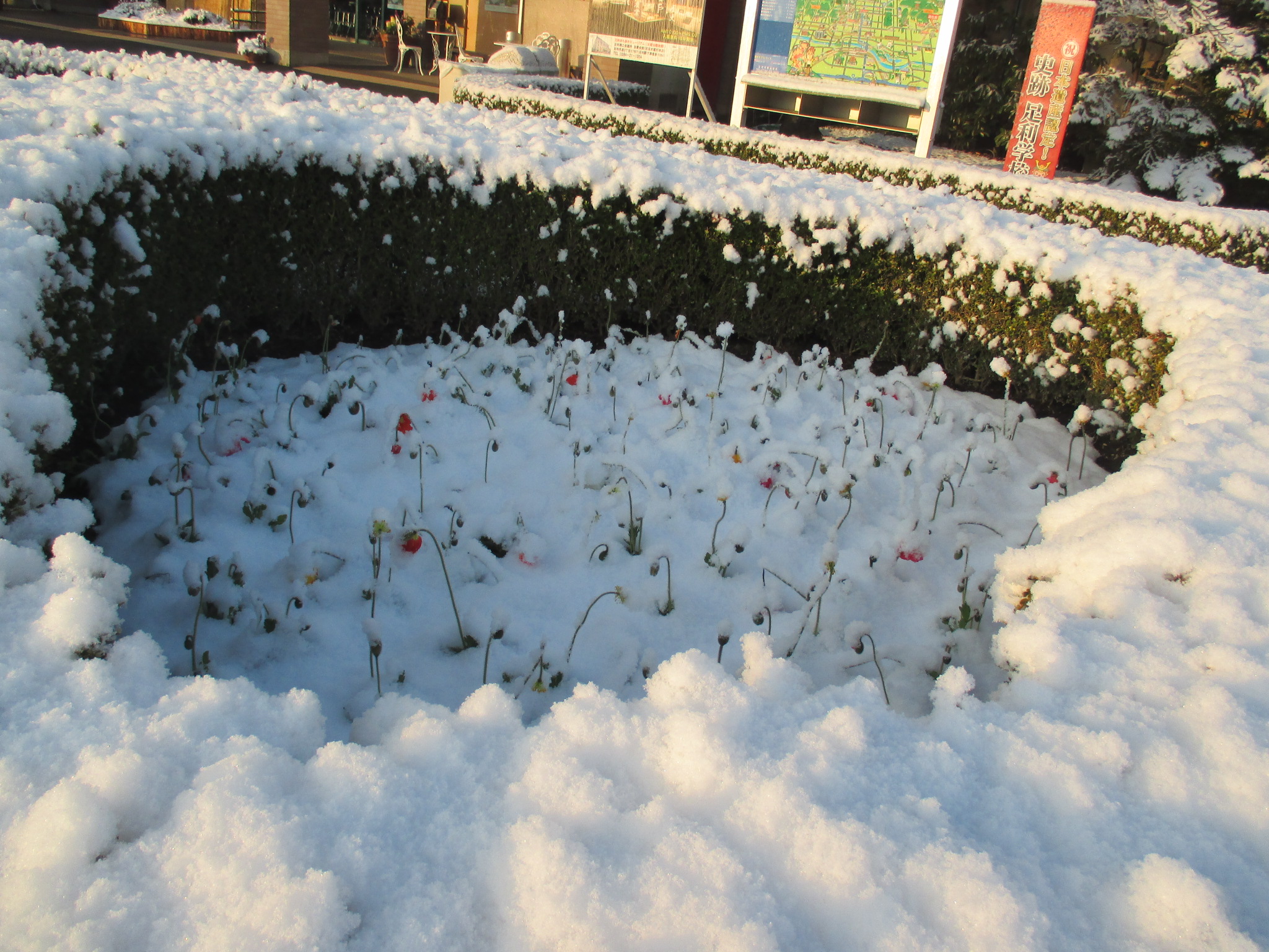 朝出勤したら、正面のアイスランドポピーや花壇は雪に埋もれておりました。